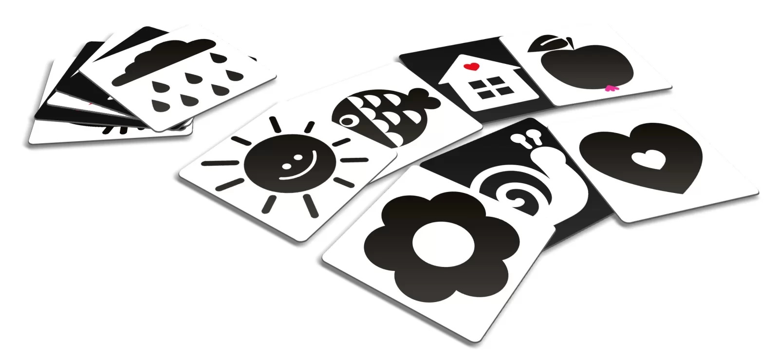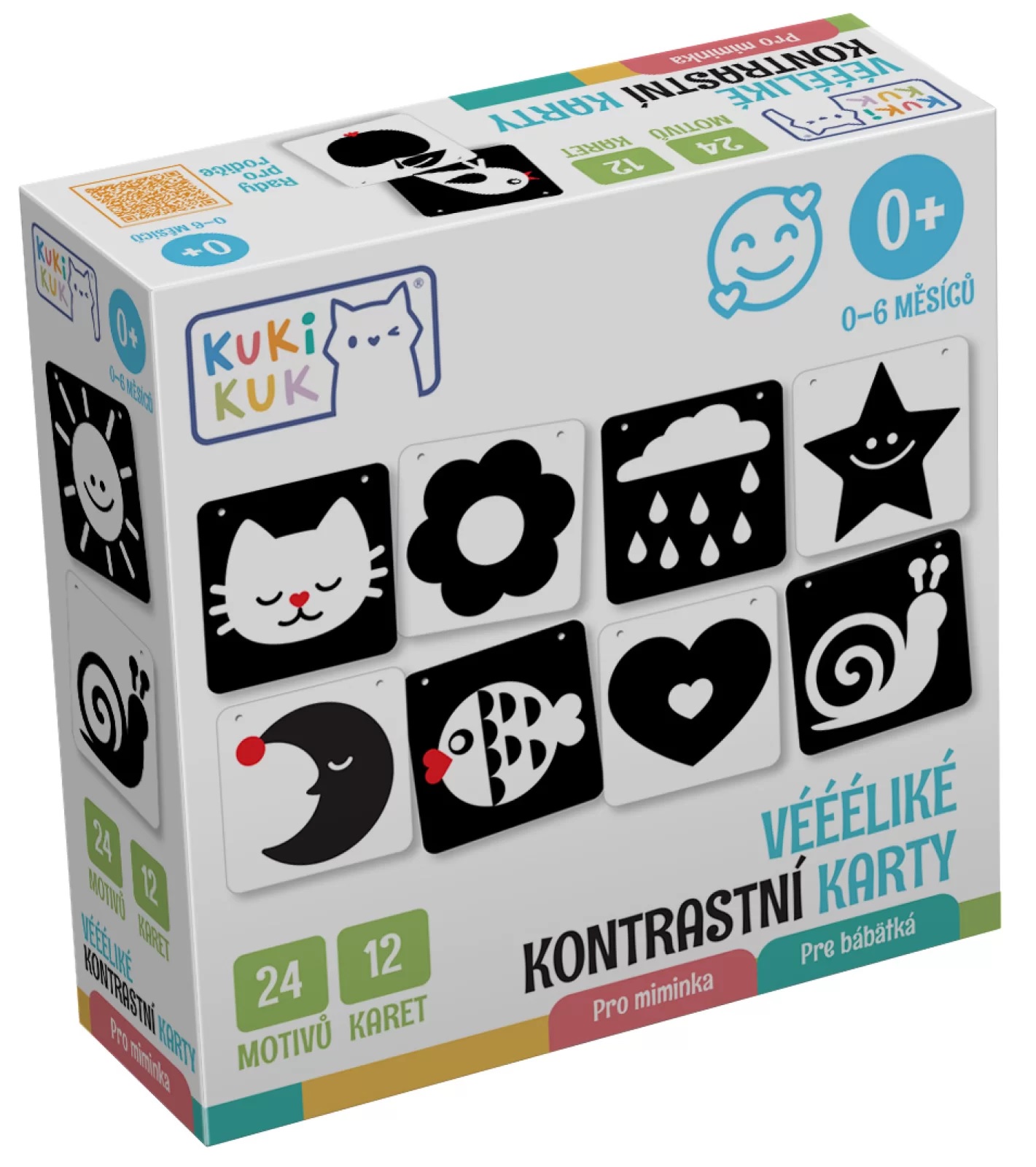 Joc educational pentru bebelusi, Flash Contrast Cards, Carduri alb-negru pentru acuitate vizuala, KuKiKuk Efko, 12 piese, 24 imagini mari contrastante, carton gros, varsta 0-6 luniFolosirea imaginilor contrastante pentru bebelusi are un impact pozitiv asupra dezvoltarii lor si este una dintre numeroasele modalitati de a sprijini abilitatile lor cognitive si vizuale inca de la o varsta foarte frageda. Setul de 24 de imagini contrastante mari este ideal pentru dezvoltarea naturala a vederii si atentiei bebelusilor. Include sfaturi pentru parinti, elaborate pe baza studiilor de specialitate si recomandarilor expertilor.Setul de 24 de imagini contrastante mari este un mijloc ideal pentru dezvoltarea vederii si atentiei bebelusilor. Utilizarea acestora este pe deplin sustinuta de experti.12 carduri fata-verso24 de imagini