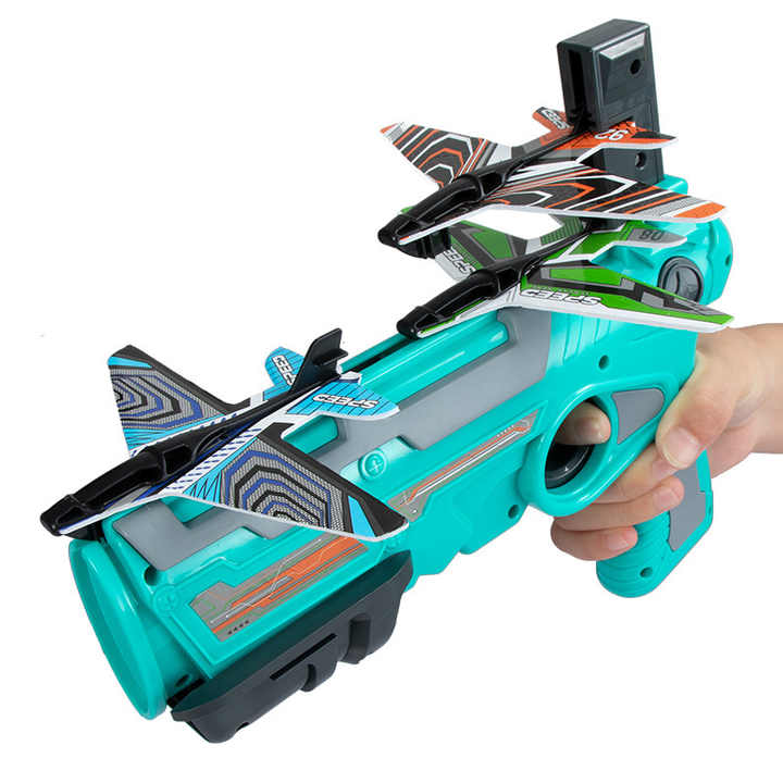 Jucarie tip lansator cu 3 avioane Lansator de jucarie cu 4 avioane va deveni jucaria preferata a copilului tau! O jucarie distractiva si, in acelasi timp, motrica deoarece stimuleaza copilul sa faca miscare. Pot fi organizate concursuri, cel care le lanseaza pe o distanta cat mai mare, castigand concursul. Mod de functionare: Se aseaza cele 4 avioane in locasurile speciale, se armeaza pistolul si se arunca primul avion. Apoi, se apasa pe incarcator, aducand in pozitie de tragere al doilea avion. Se armeaza, din nou, pistolul si se lanseaza cel de al doilea avion. Se repeta manevrele pana la lansarea celui de al patrulea avion. Avioanele zboara pana la 6-8 metri. Nu necesita baterii Dimensiuni pistol: 25 cm x 15 cm x 8 cm Dimensiuni avion: 14 cm x 9 cm Recomandat copiilor de peste 3 ani Material ABS