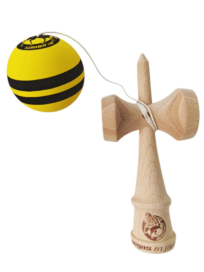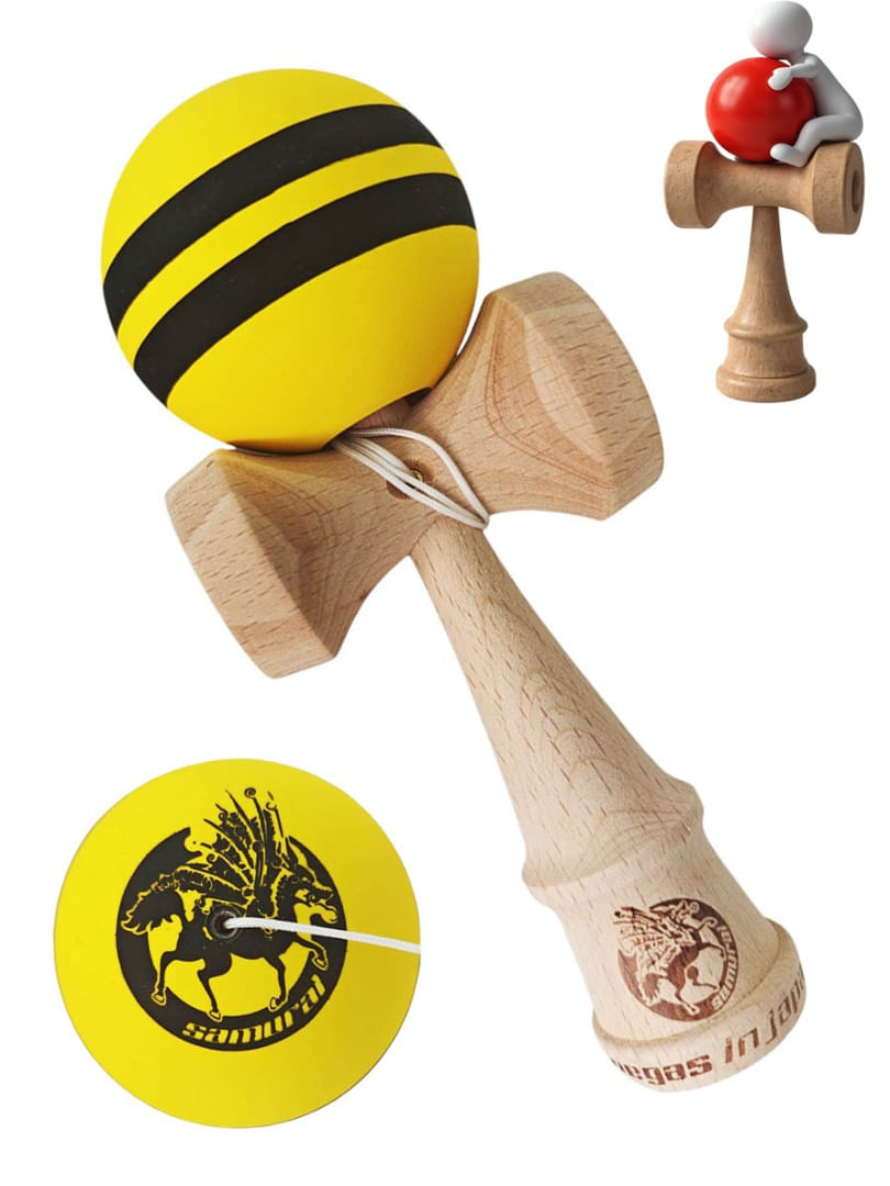 Kendama profesionala, Bila din lemn, Samurai + Sticker pentru telefon Aceasta Kendama este ideala pentru pasionatii de jocuri de indemanare si colectie. Designul sau modern imbina bila cu dungi – pentru o vizibilitate mai buna in timpul miscarilor – cu un maner elegant din lemn, cu textura naturala si gravura decorativa Designed in Japan. Un produs ce ofera atat performanta, cat si stil. Continut pachet: - 1 x Kendama profesionala cu bila - 1 x Sticker decorativ (6 cm), ideal pentru telefon sau alte suprafete - 1 x Snur Caracteristici: - Fabricata din lemn durabil si bine finisat - Dimensiuni Kendama: aproximativ 18 x 7 cm - Maner personalizabil prin pictura, gravura sau markere permanente Beneficii: - Dezvolta coordonarea, reflexele si concentrarea - Potrivita pentru toate nivelurile – incepatori si avansati Recomandare varsta: 6 ani+ Avertismente: Atentie! Nu lasati la indemana copiilor sub 6 ani. Produsul contine snur si bila poate prezenta risc de strangulare sau sufocare. Se recomanda utilizarea sub supravegherea unui adult.