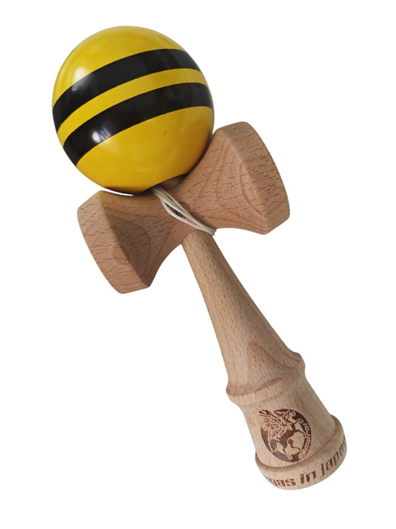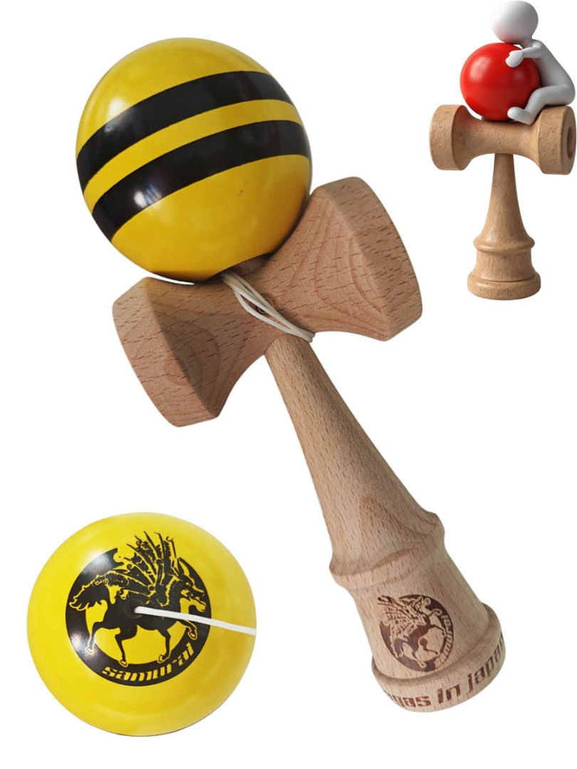Kendama profesionala, Bila din lemn, Samurai + Sticker pentru telefon Aceasta Kendama este ideala pentru pasionatii de jocuri de indemanare si colectie. Designul sau modern imbina bila cu dungi – pentru o vizibilitate mai buna in timpul miscarilor – cu un maner elegant din lemn, cu textura naturala si gravura decorativa Designed in Japan. Un produs ce ofera atat performanta, cat si stil. Continut pachet: - 1 x Kendama profesionala cu bila - 1 x Sticker decorativ (6 cm), ideal pentru telefon sau alte suprafete - 1 x Snur Caracteristici: - Fabricata din lemn durabil si bine finisat - Dimensiuni Kendama: aproximativ 18 x 7 cm - Maner personalizabil prin pictura, gravura sau markere permanente Beneficii: - Dezvolta coordonarea, reflexele si concentrarea - Potrivita pentru toate nivelurile – incepatori si avansati Recomandare varsta: 6 ani+ Avertismente: Atentie! Nu lasati la indemana copiilor sub 6 ani. Produsul contine snur si bila poate prezenta risc de strangulare sau sufocare. Se recomanda utilizarea sub supravegherea unui adult.