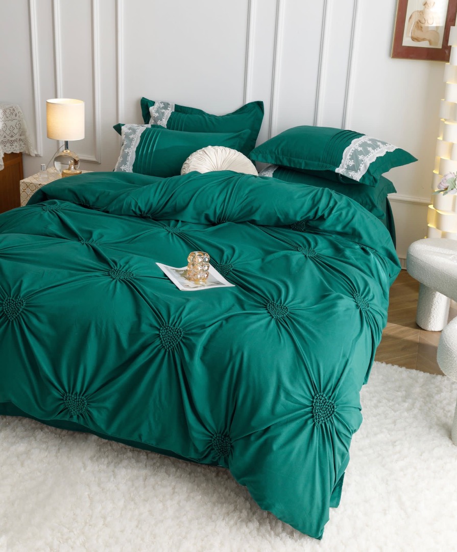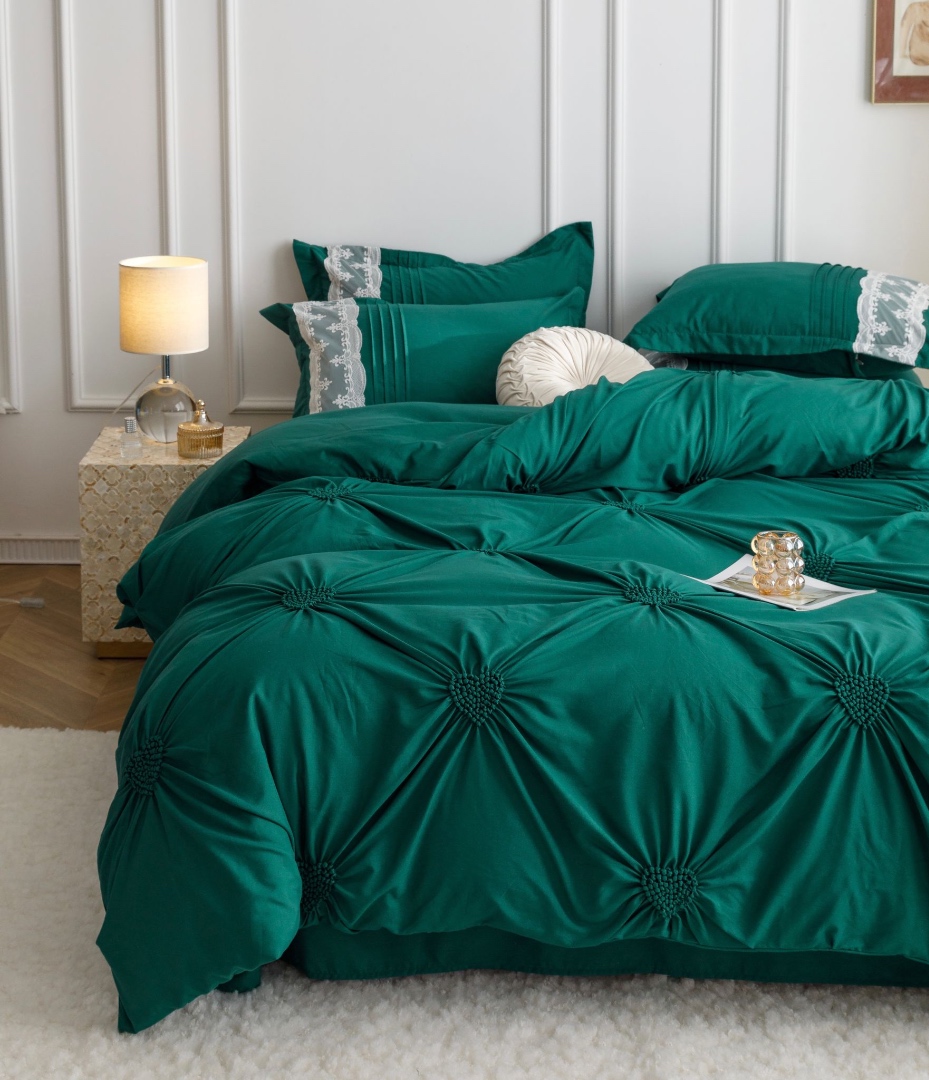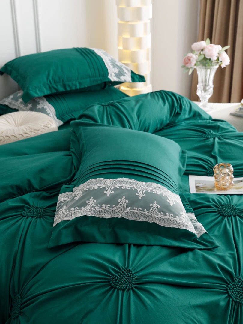 Lenjerie de Pat 6 Piese – Finet Soft Touch cu Pliuri Brodate in forma de Inimioara si Dantela Delicata     O lenjerie de pat care imbina eleganta detaliilor brodate cu rasfatul unui material ultra-moale – Finet Soft Touch, acum si mai fin la atingere. Designul cu inimioare brodate si pliuri fine, lucrate atent, este completat de dantela rafinata aplicata pe o latura a fetelor de perna, pentru un efect vizual deosebit si un plus de rafinament in orice dormitor.   Material premium: Finet