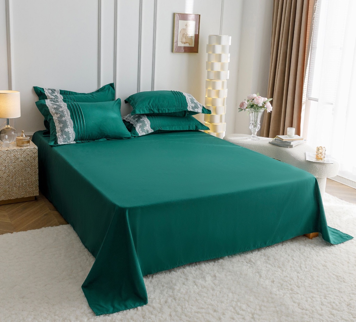 Lenjerie de Pat Premium, JOJO HOME, Finet cu Pliuri Brodate, 6 Piese, Nesifonabila si Durabila, Alb