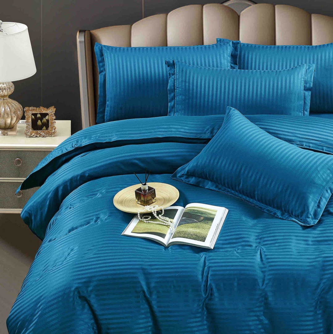 Lenjerie de pat dublu din damasc finetat, linear (tesatura din fabrica, ci nu imprimata, cu dunga de 1 cm grosime), confectionata din bumbac 70% + 30% poliester, cu 6 piese, folosita cel mai mult in regimul hotelier, datorita simplitatii si calitatii extraordinare. Materialul are un aspect usor lucios pentru o nota de eleganta si rafinament, datorita tesaturii speciale. Damascul este recunoscut pentru rezistenta sa in timp la nenumarate spalari, nemodificandu-si aspectul. Damas