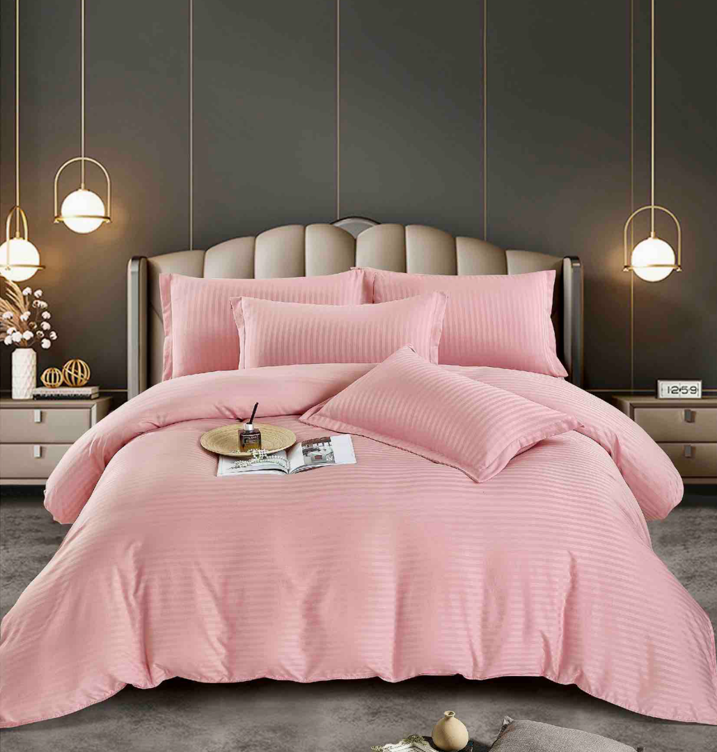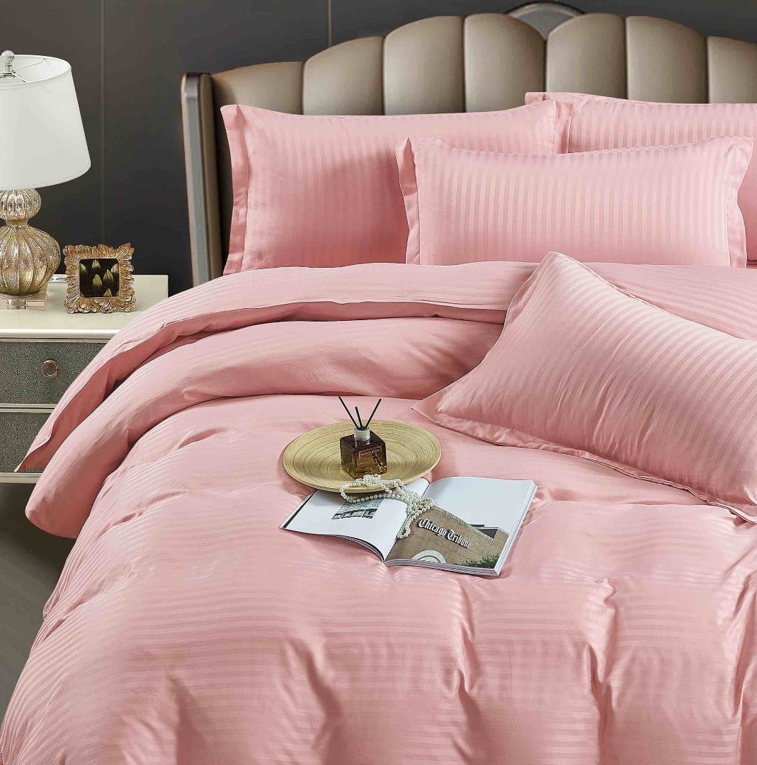 Lenjerie de pat dublu din damasc finetat, linear (tesatura din fabrica, ci nu imprimata, cu dunga de 1 cm grosime), confectionata din bumbac 70% + 30% poliester, cu 6 piese, folosita cel mai mult in regimul hotelier, datorita simplitatii si calitatii extraordinare. Materialul are un aspect usor lucios pentru o nota de eleganta si rafinament, datorita tesaturii speciale. Damascul este recunoscut pentru rezistenta sa in timp la nenumarate spalari, nemodificandu-si aspectul.     Damas