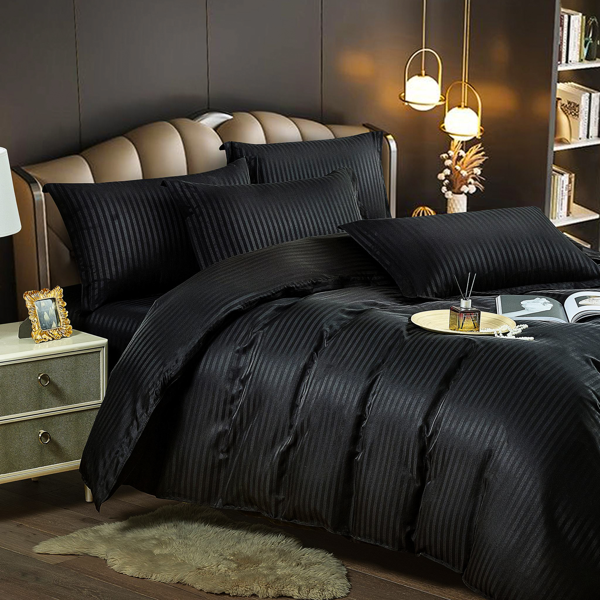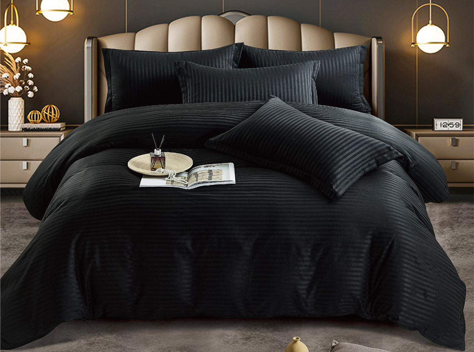 Lenjerie de pat dublu din damasc finetat, linear (tesatura din fabrica, ci nu imprimata, cu dunga de 1 cm grosime), confectionata din bumbac 70% + 30% poliester, cu 6 piese, folosita cel mai mult in regimul hotelier, datorita simplitatii si calitatii extraordinare. Materialul are un aspect usor lucios pentru o nota de eleganta si rafinament, datorita tesaturii speciale. Damascul este recunoscut pentru rezistenta sa in timp la nenumarate spalari, nemodificandu-si aspectul. Damas