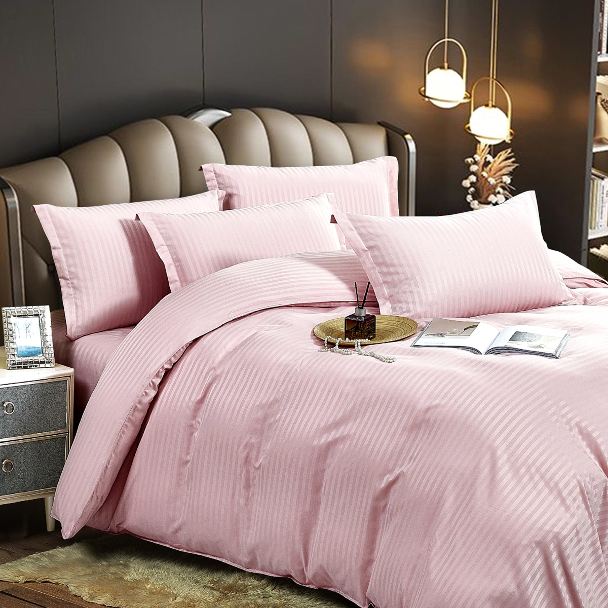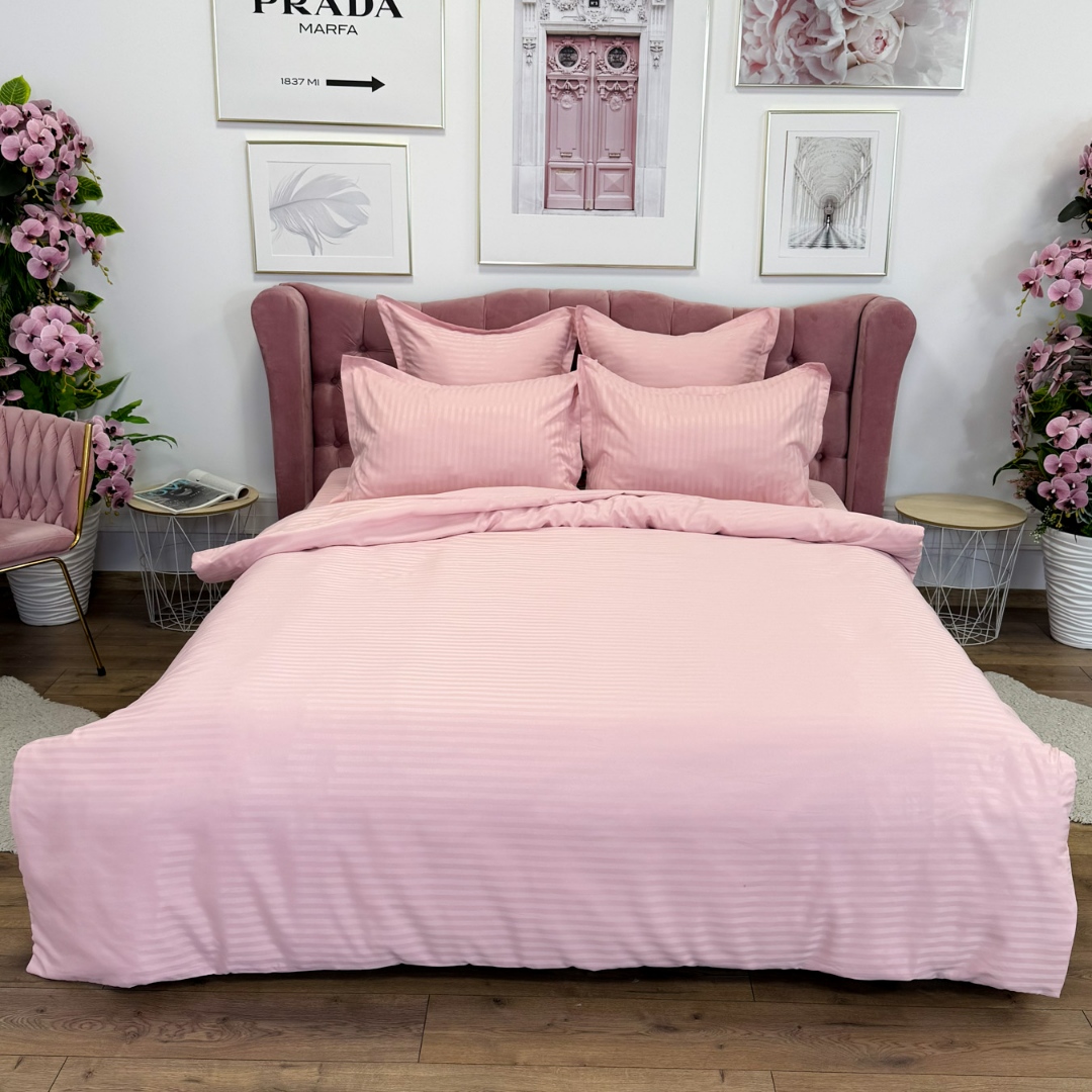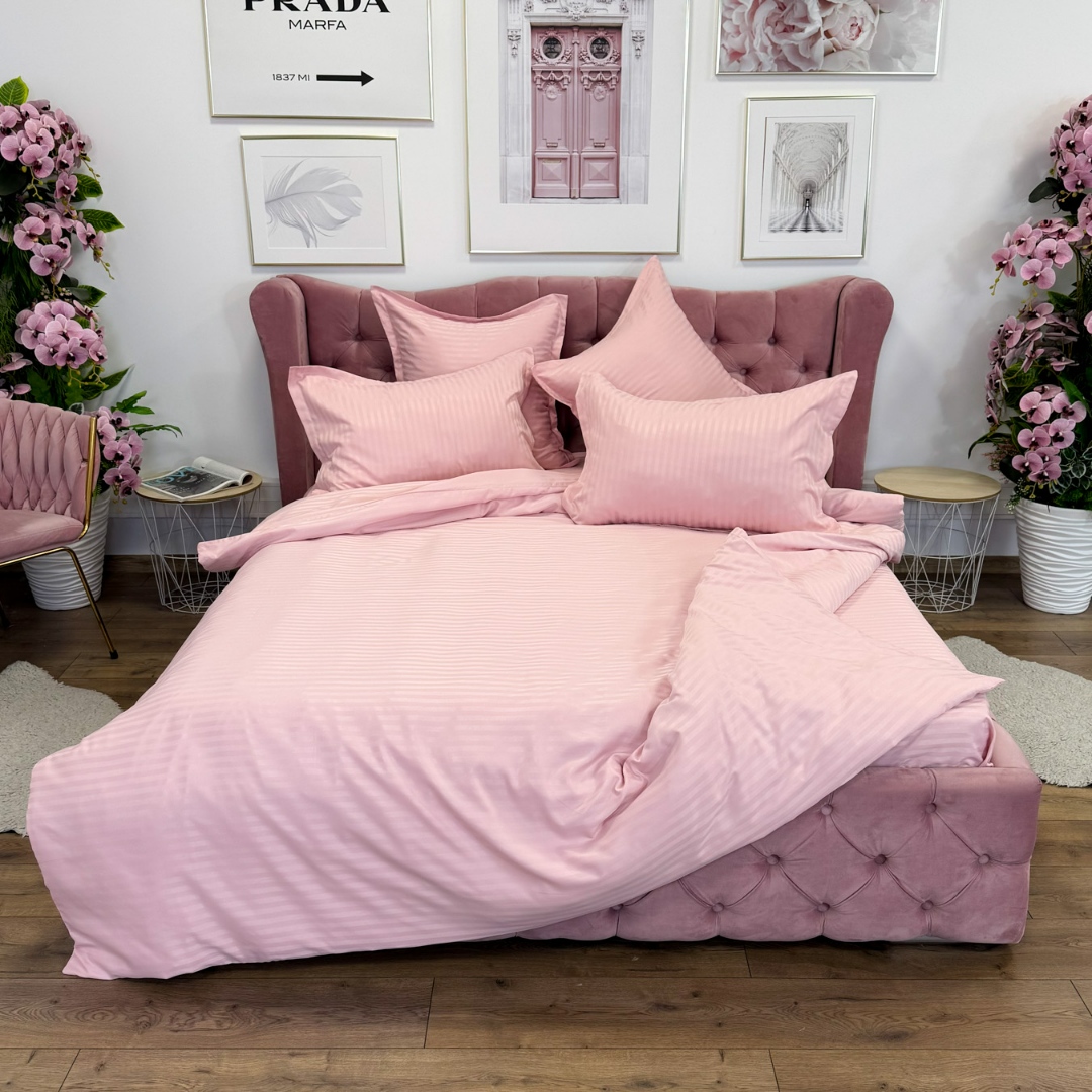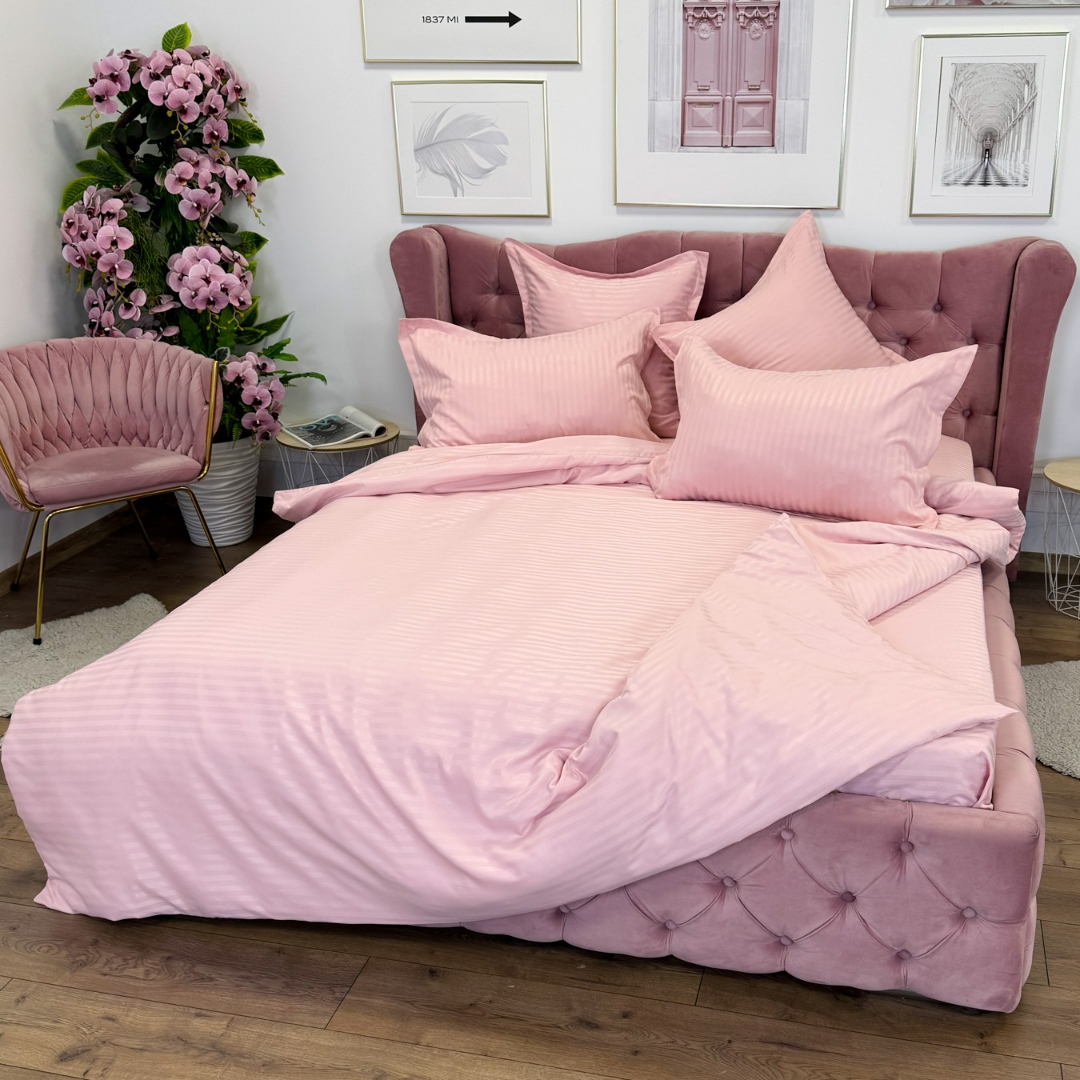 Lenjerie HoReCa, pat dublu, Damasc Finetat Deluxe cu Elastic, 6 piese, Jojo Home, Roz deschis