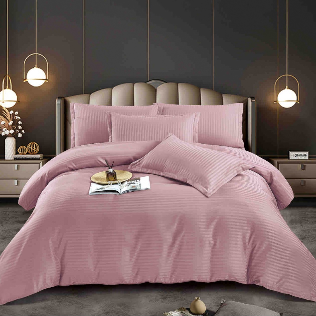 Lenjerie de pat dublu din damasc finetat, linear (tesatura din fabrica, ci nu imprimata, cu dunga de 1 cm grosime), confectionata din bumbac 70% + 30% poliester, cu 6 piese, folosita cel mai mult in regimul hotelier, datorita simplitatii si calitatii extraordinare. Materialul are un aspect usor lucios pentru o nota de eleganta si rafinament, datorita tesaturii speciale. Damascul este recunoscut pentru rezistenta sa in timp la nenumarate spalari, nemodificandu-si aspectul. Damas
