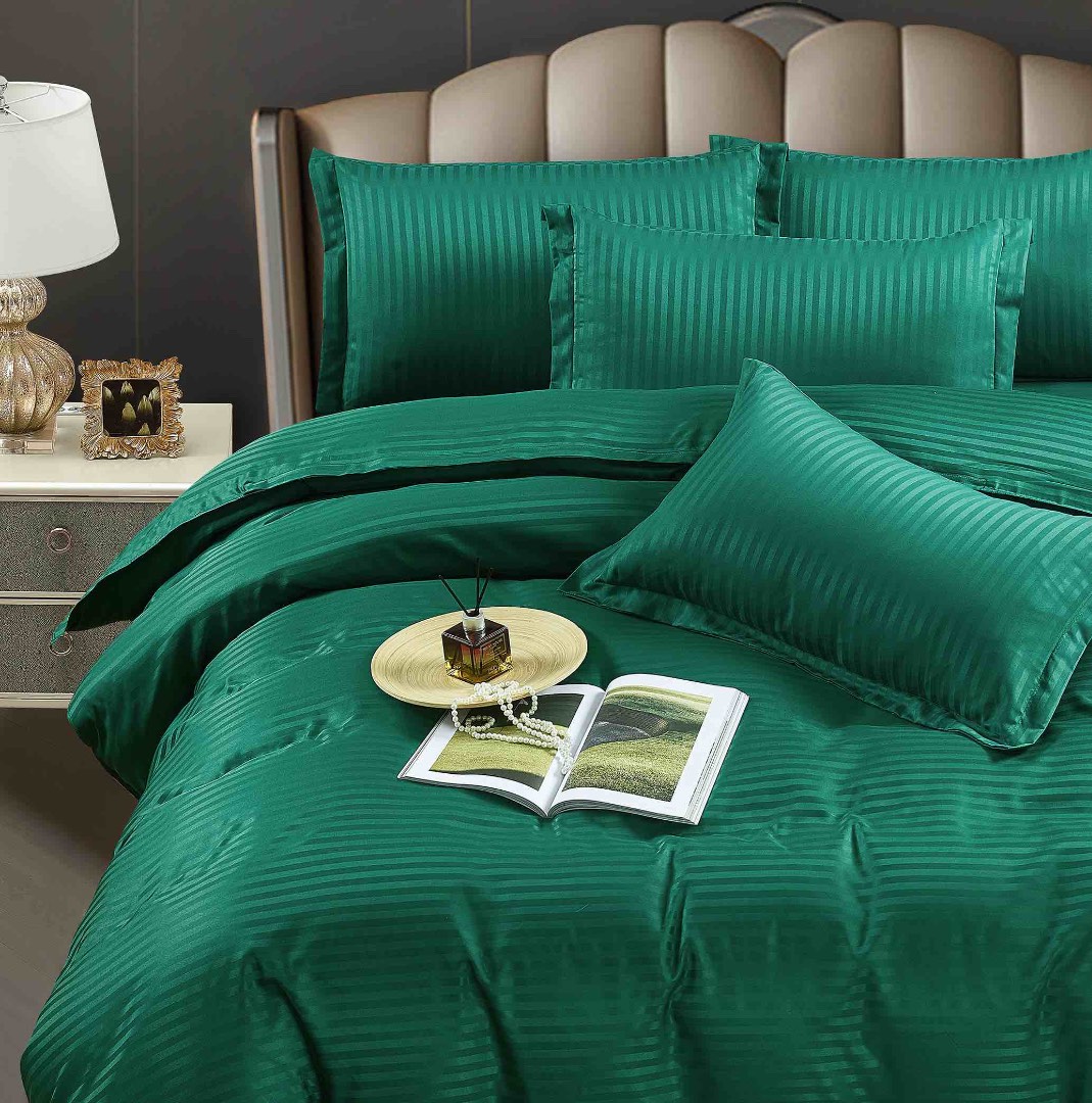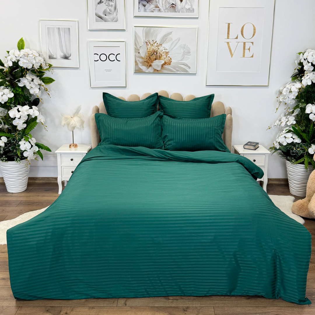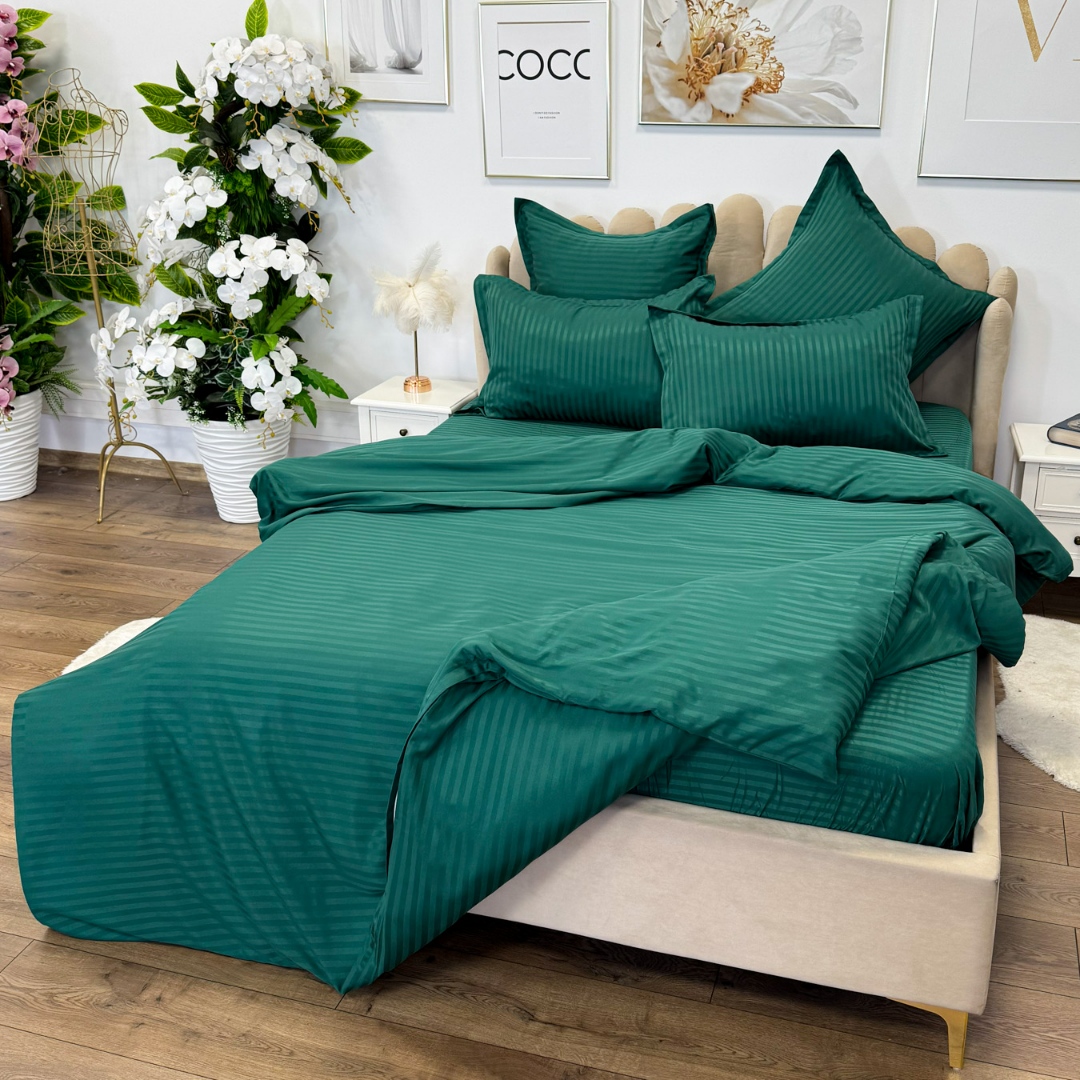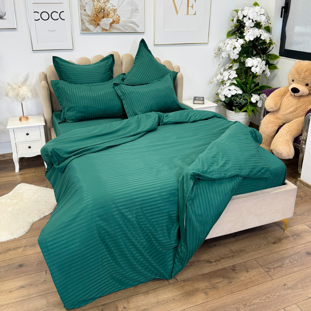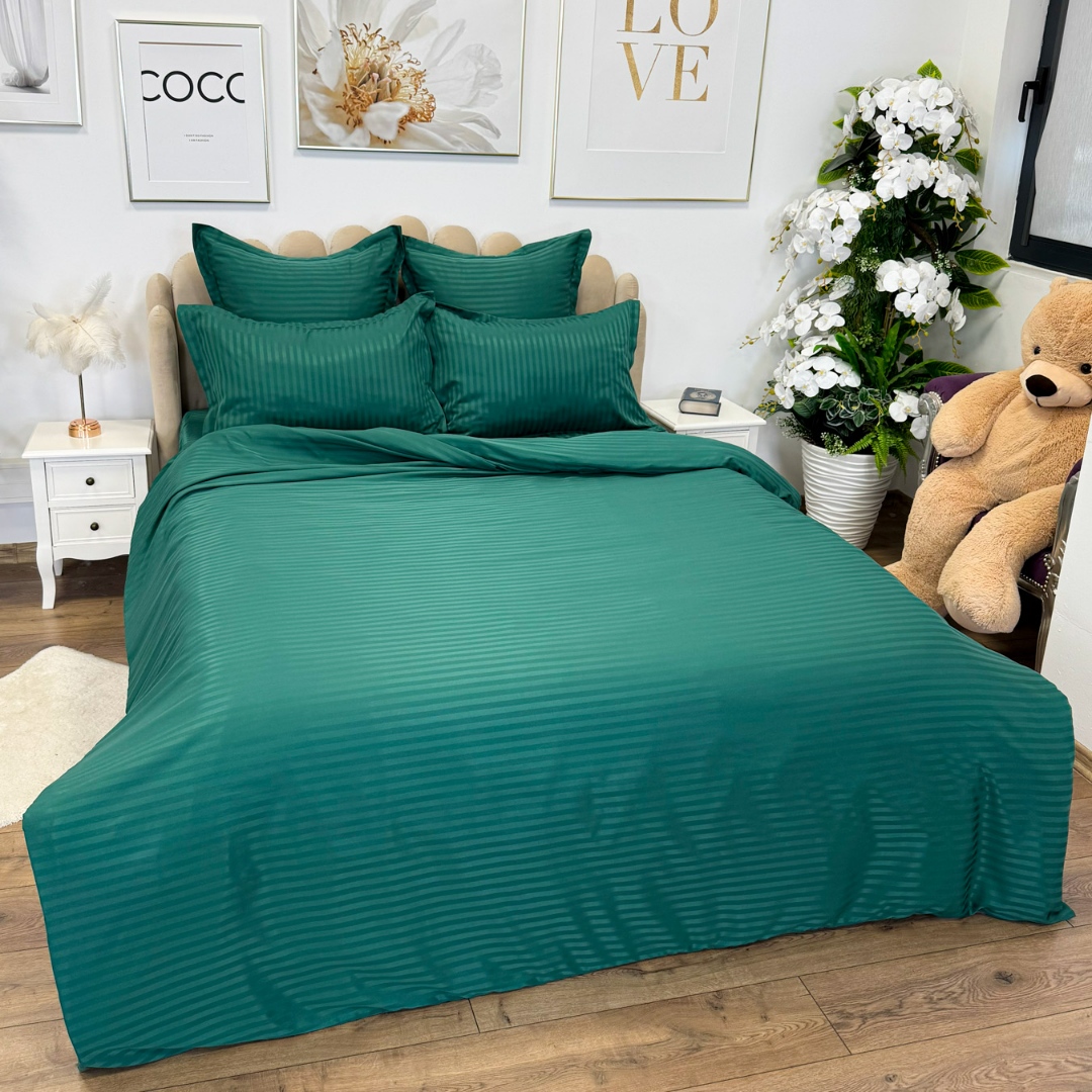 Lenjerie HoReCa, pat dublu, Damasc Finetat Deluxe cu Elastic, 6 piese, Jojo Home, Verde Smarald