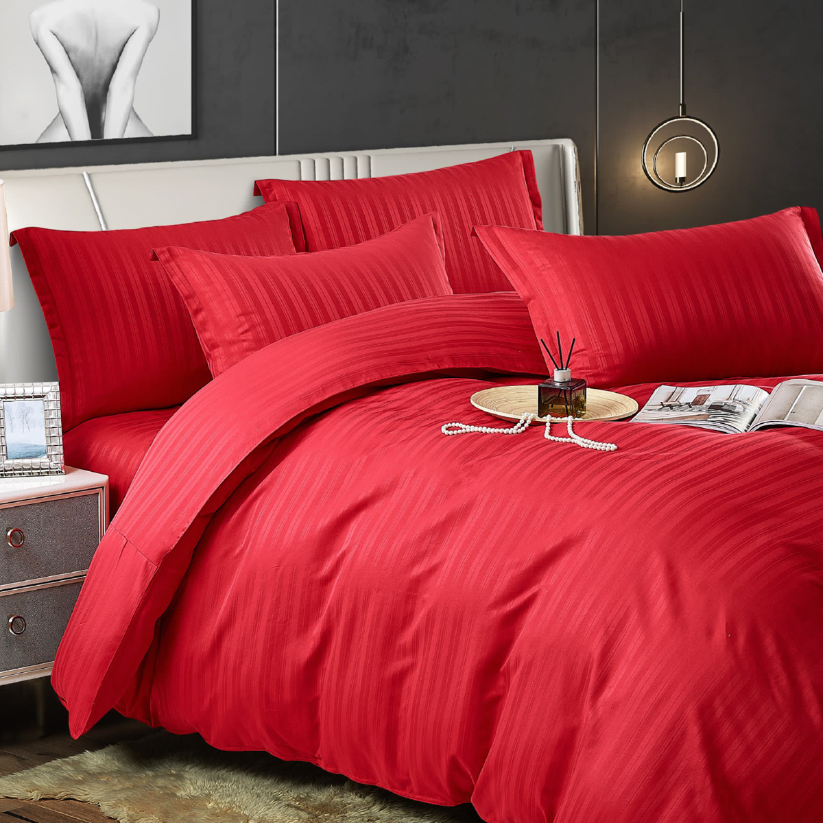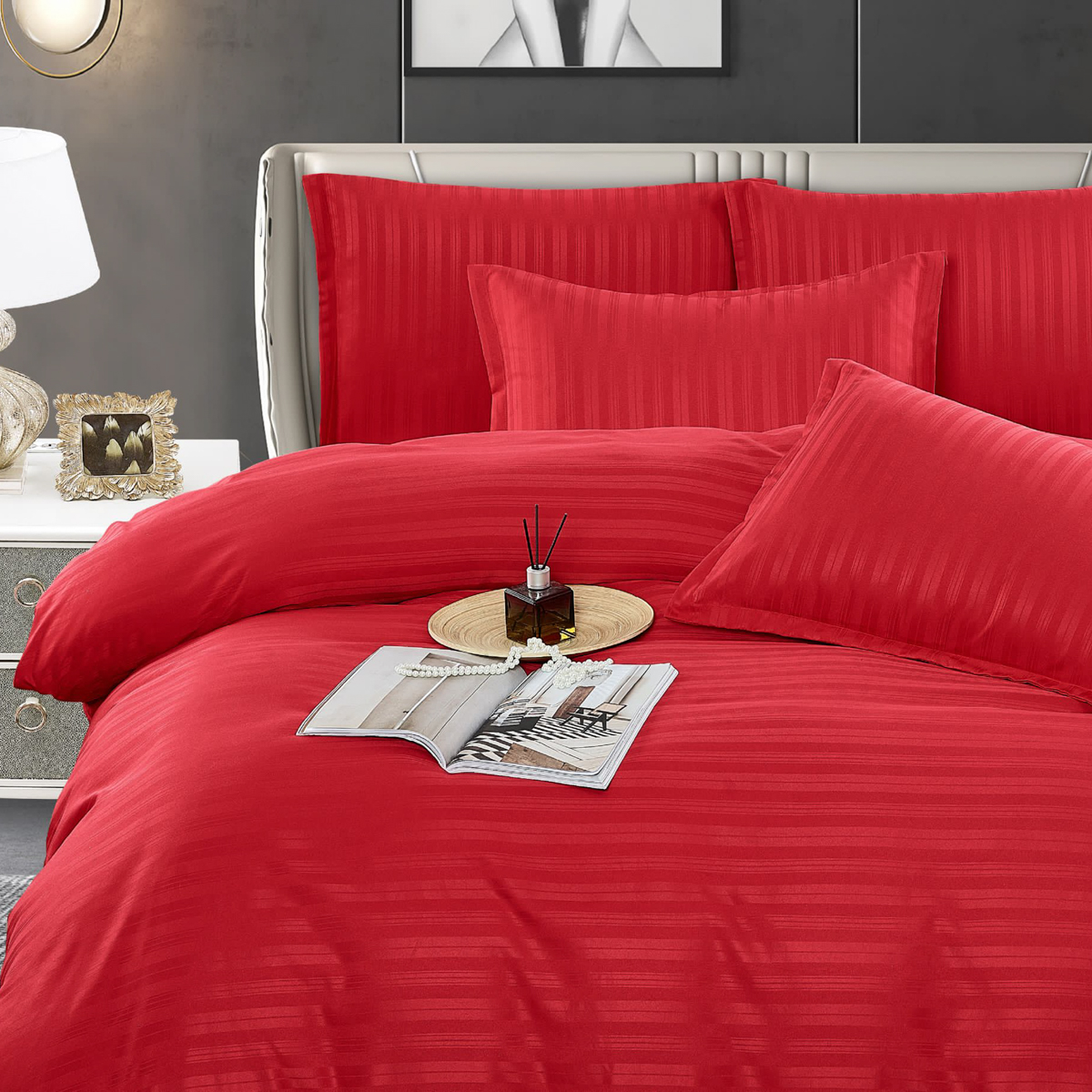 Lenjerie de pat dublu din damasc finetat, linear (tesatura din fabrica, ci nu imprimata, cu dunga de 1 cm grosime), confectionata din bumbac 70% + 30% poliester, cu 6 piese, folosita cel mai mult in regimul hotelier, datorita simplitatii si calitatii extraordinare. Materialul are un aspect usor lucios pentru o nota de eleganta si rafinament, datorita tesaturii speciale. Damascul este recunoscut pentru rezistenta sa in timp la nenumarate spalari, nemodificandu-si aspectul. Damas