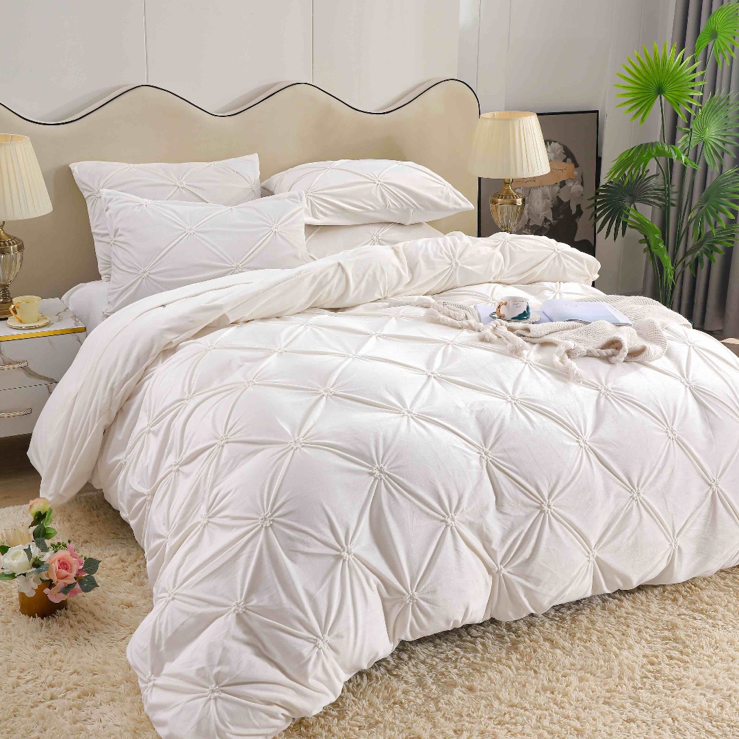 Lenjerie pufoasa din catifea cu 4 piese, pentru pat dublu, cu pliuri brodate, ce te invita la un somn relaxant, de la prima vedere.