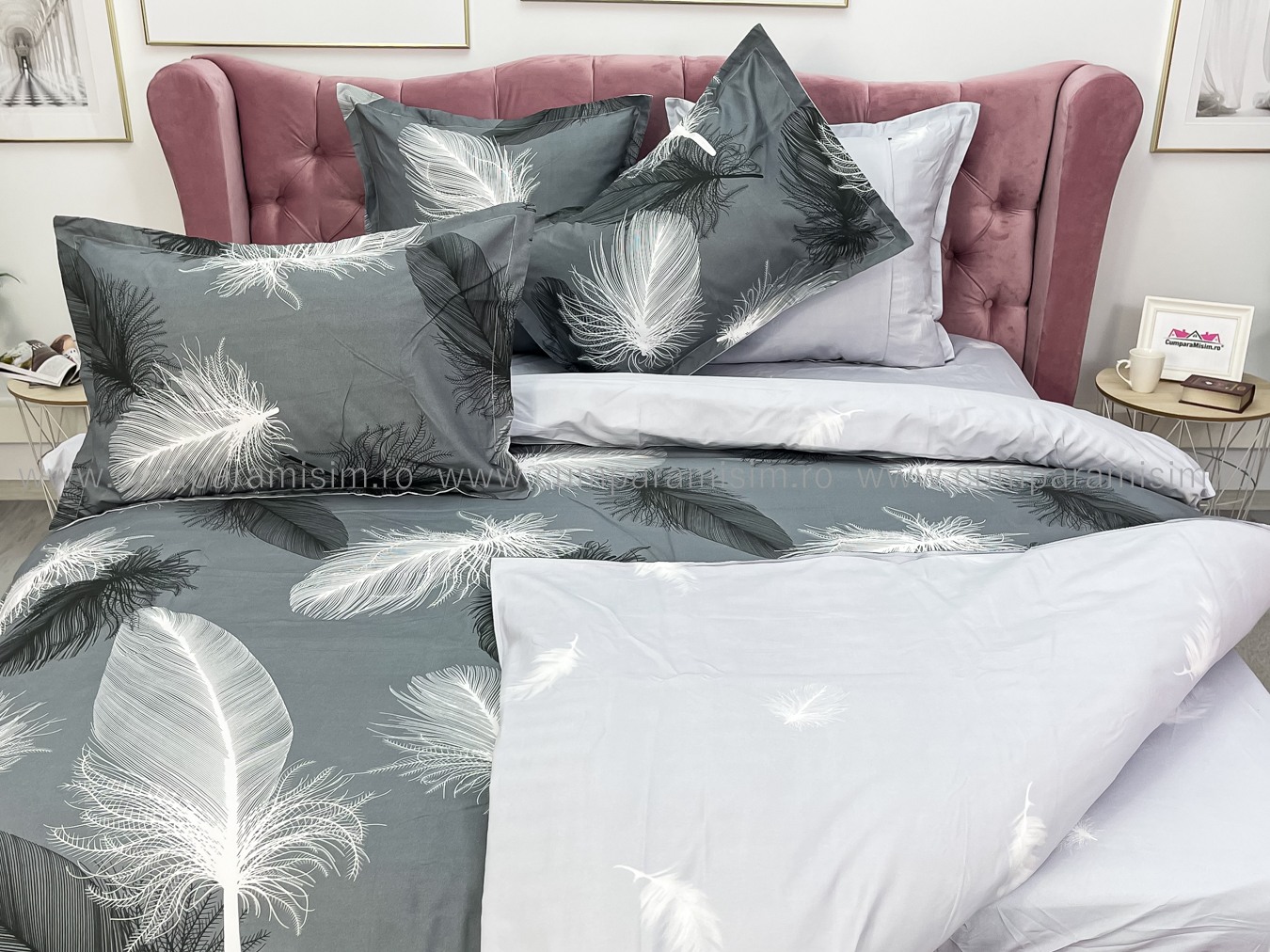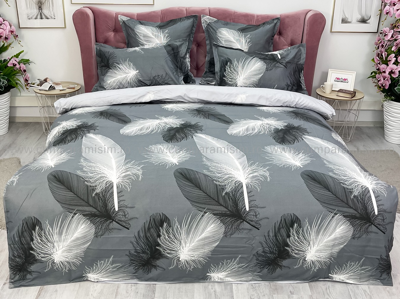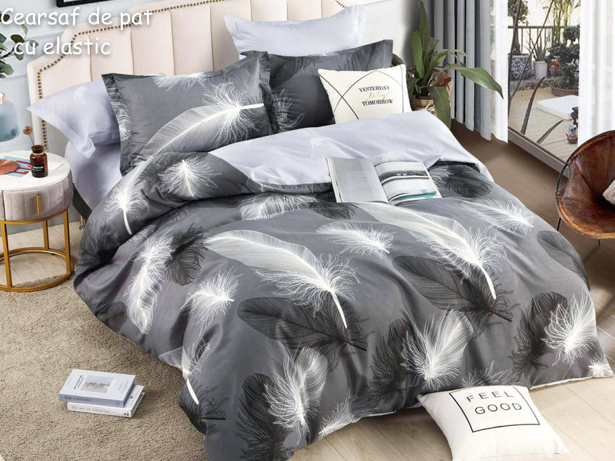 Lenjerie pat dublu, FINET, 6 piese, cu ELASTIC, Jojo Home, Gri-Alb, pene