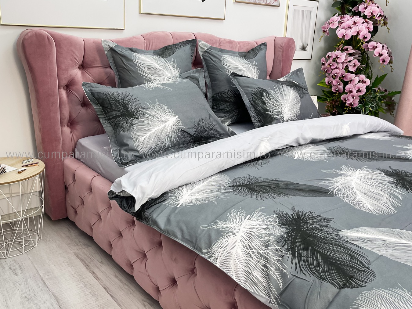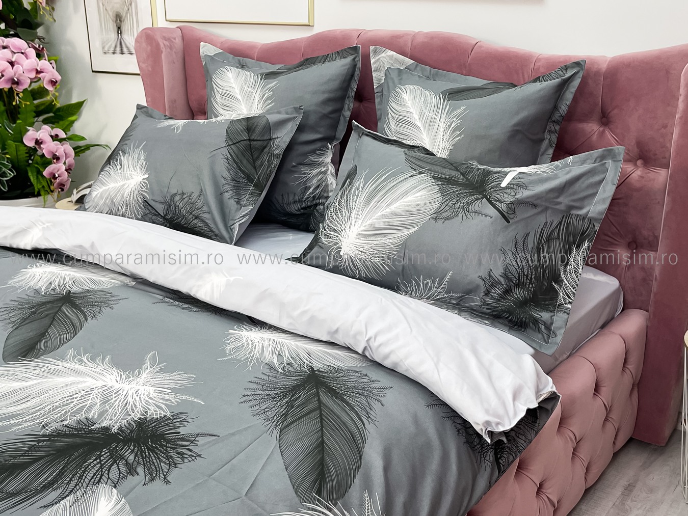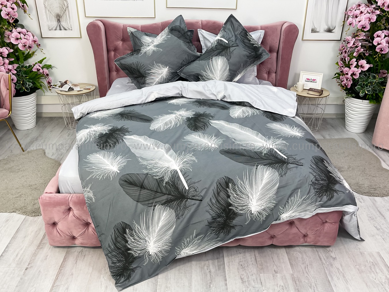 Lenjerie pat dublu, FINET, 6 piese, cu ELASTIC, Jojo Home, Gri-Alb, pene