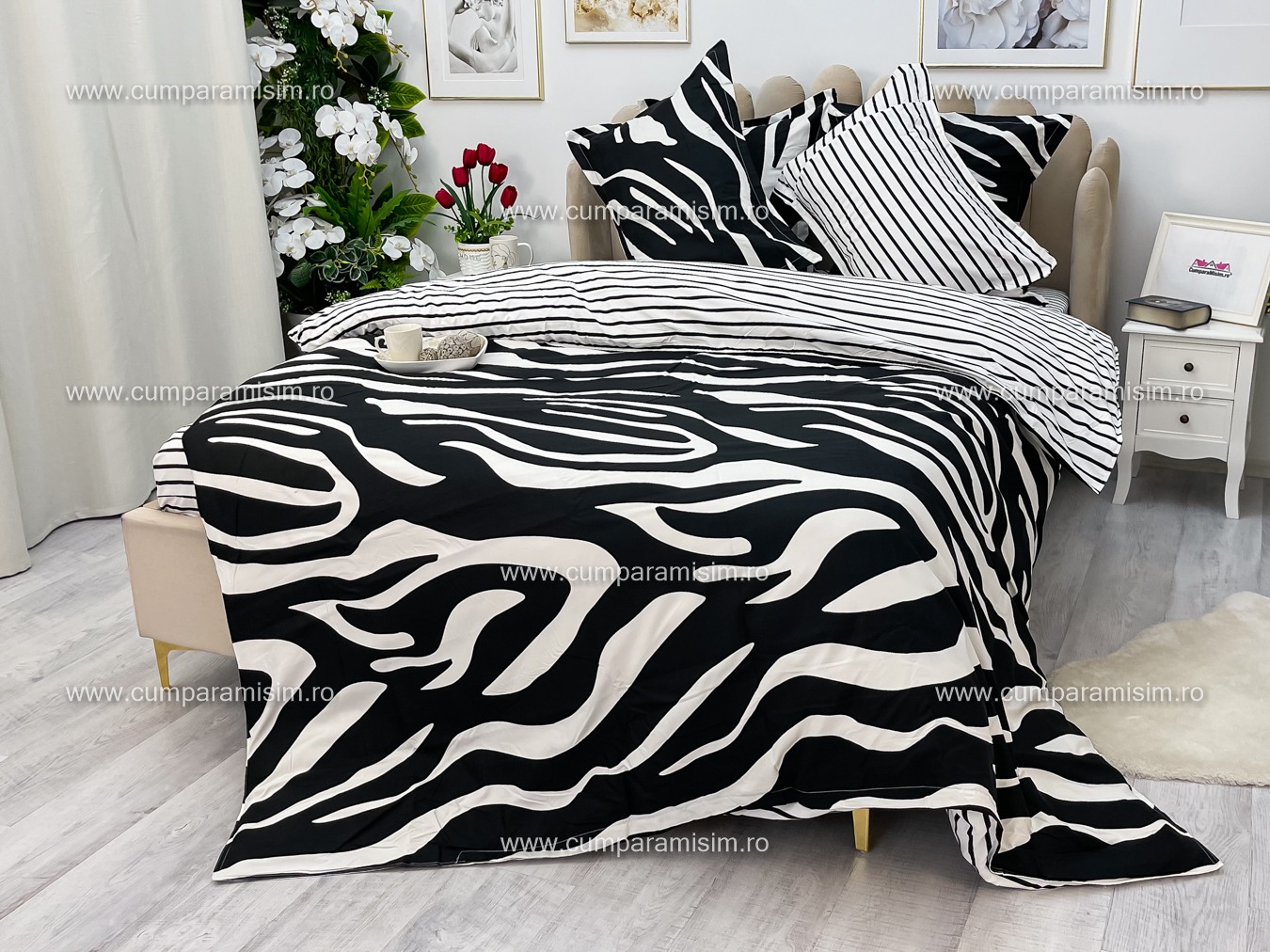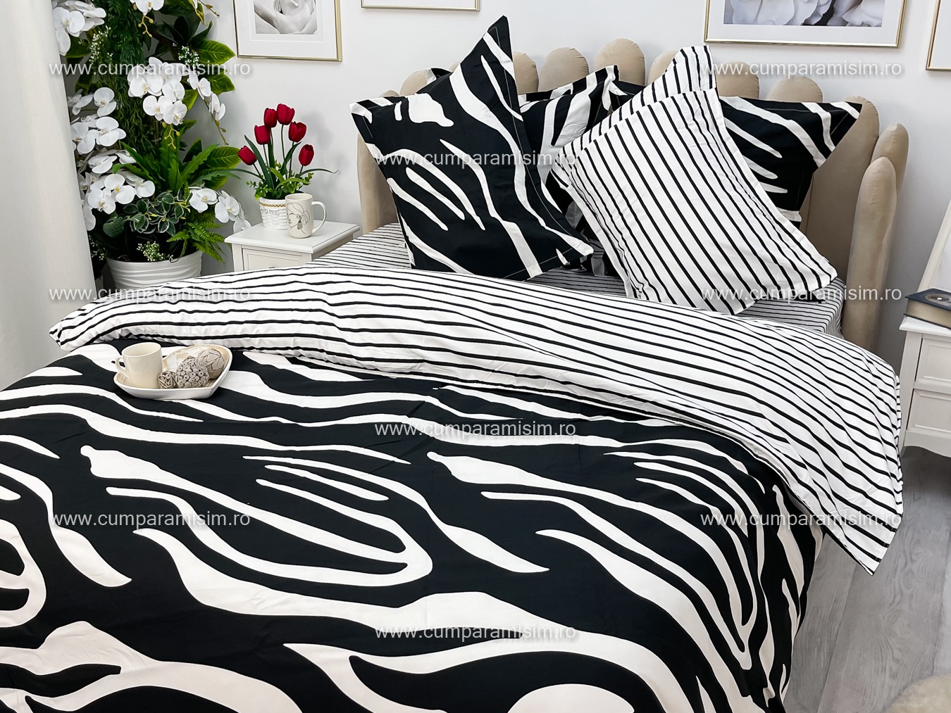 Lenjerie pat dublu, FINET, 6 piese, Jojo Home, Alb-Negru, animal print