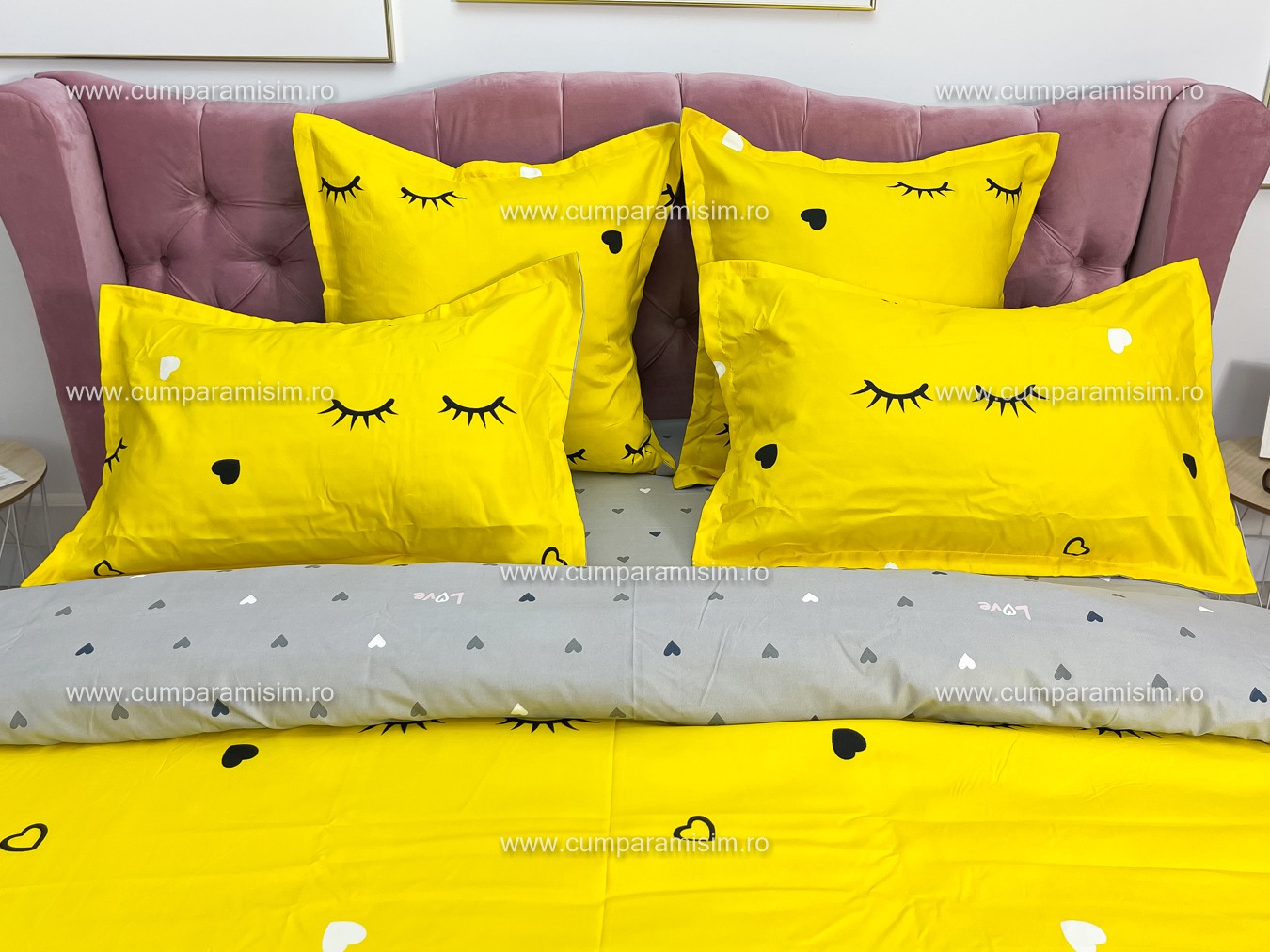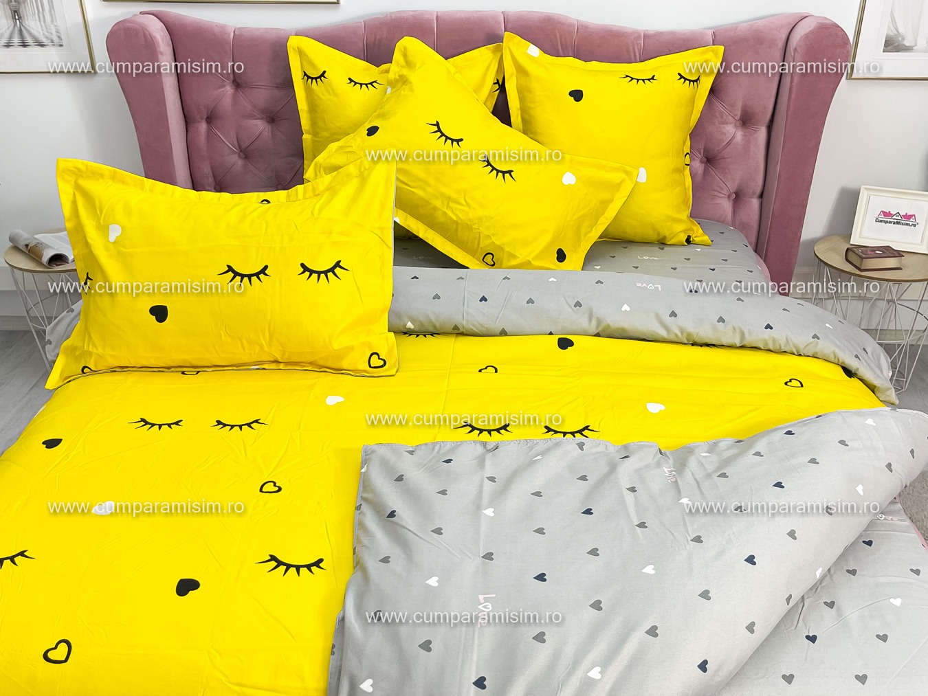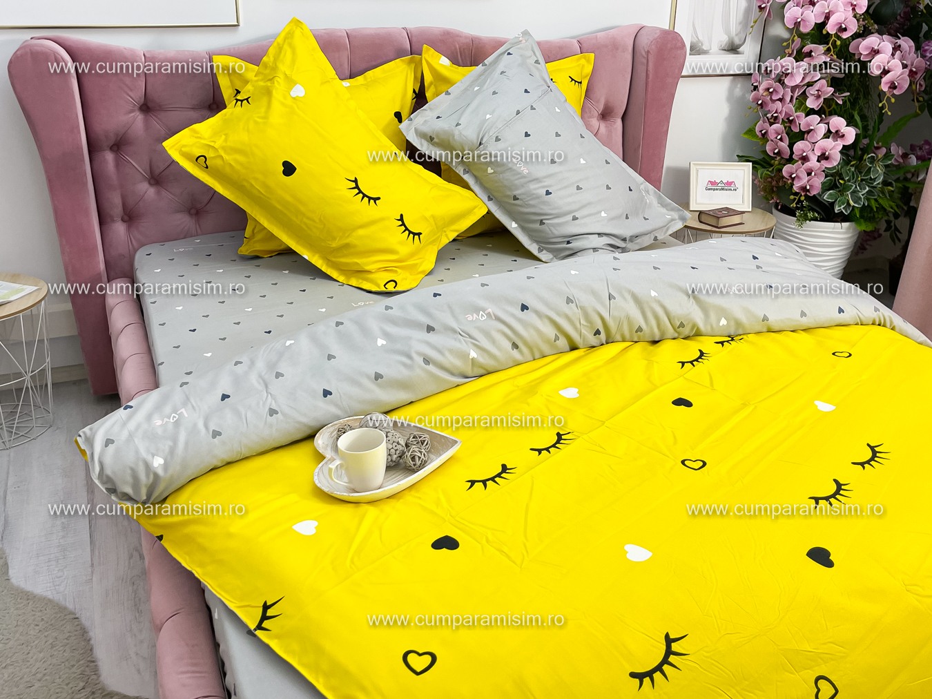 Lenjerie pat dublu, FINET, 6 piese, Jojo Home, Galben-Gri, gene, inimioare