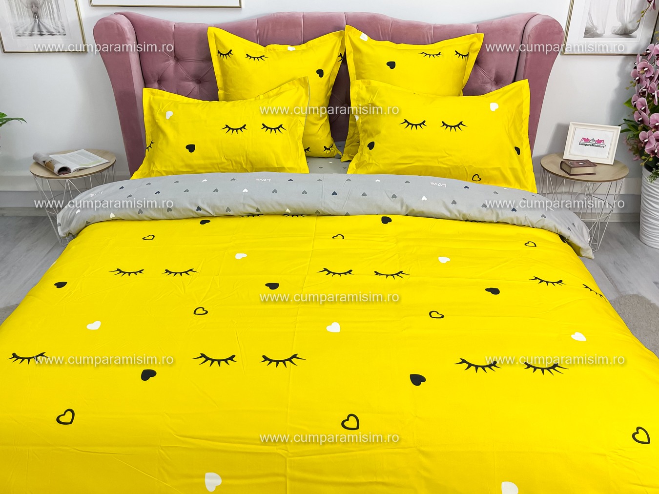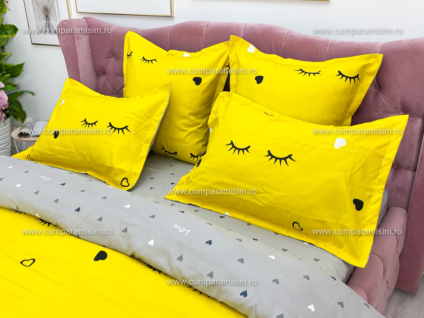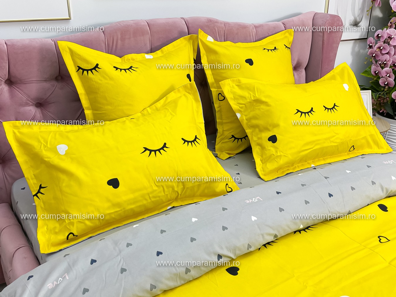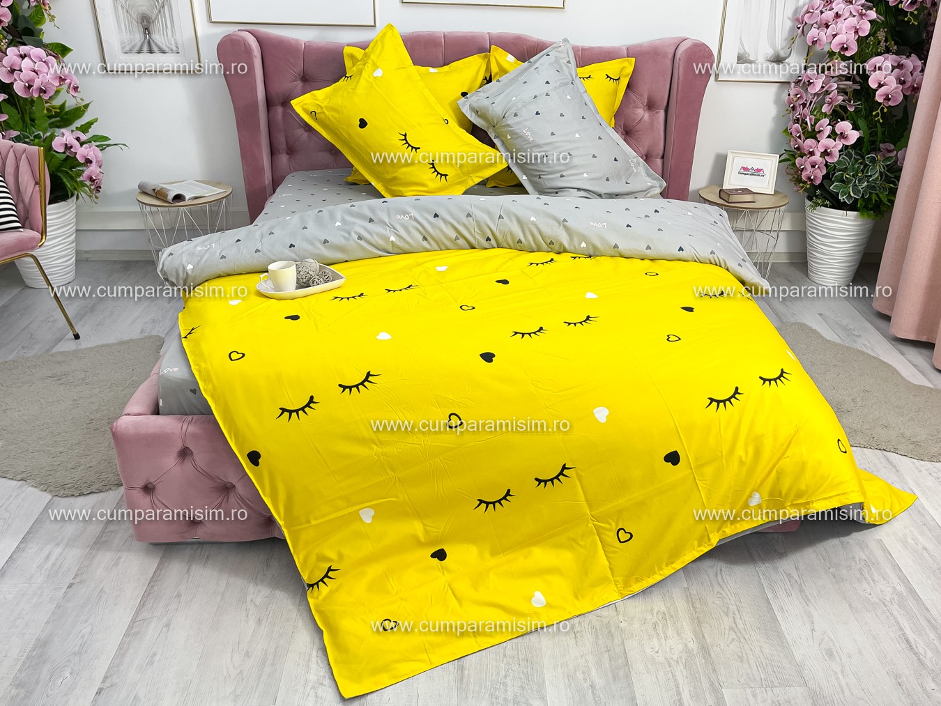 Lenjerie pat dublu, FINET, 6 piese, Jojo Home, Galben-Gri, gene, inimioare