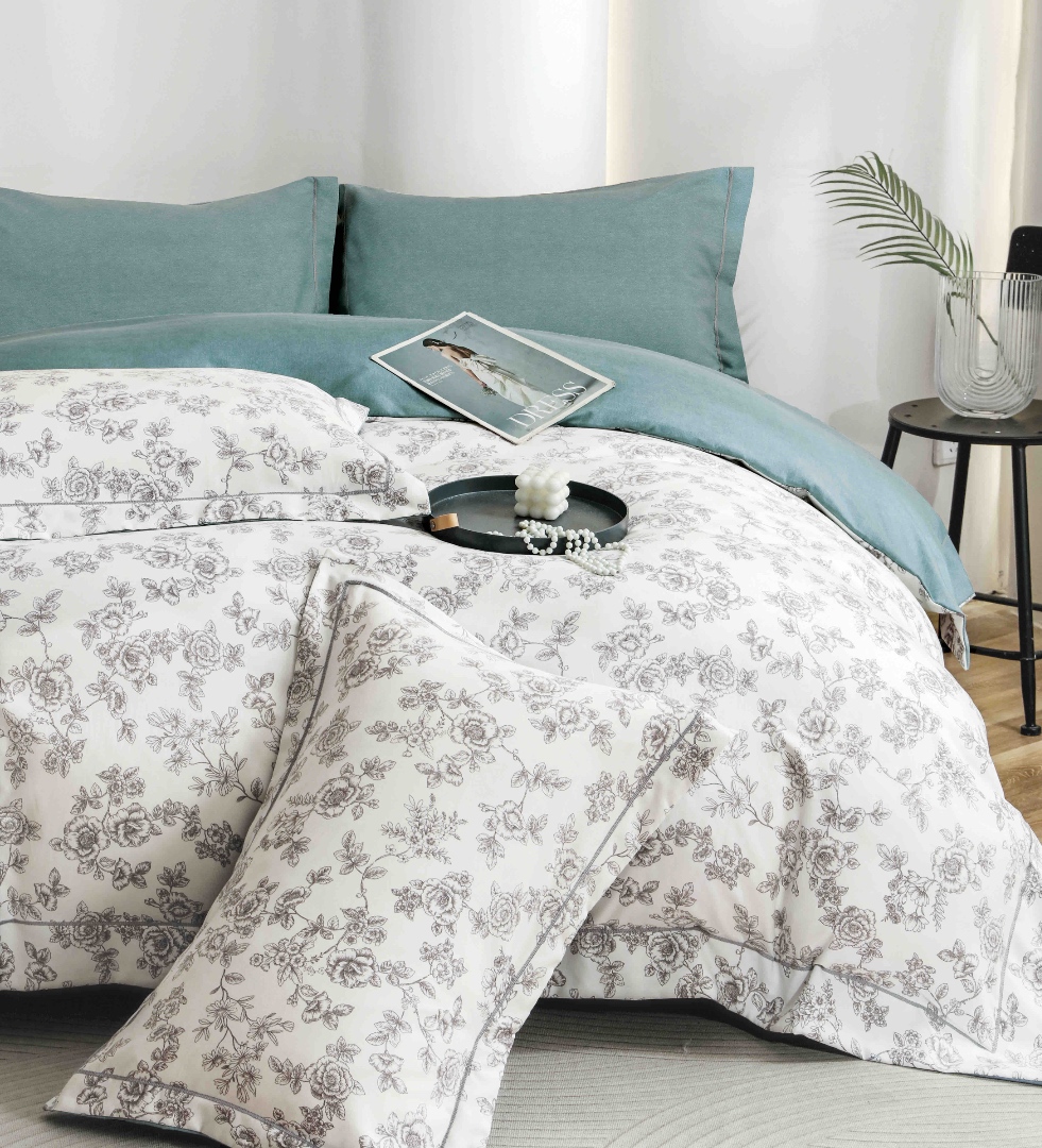 Lenjerie pat dublu, FINET DeLuxe, 6 piese, cu ELASTIC, Jojo Home, Cutie Eleganta, Alb, Bleu, Flori