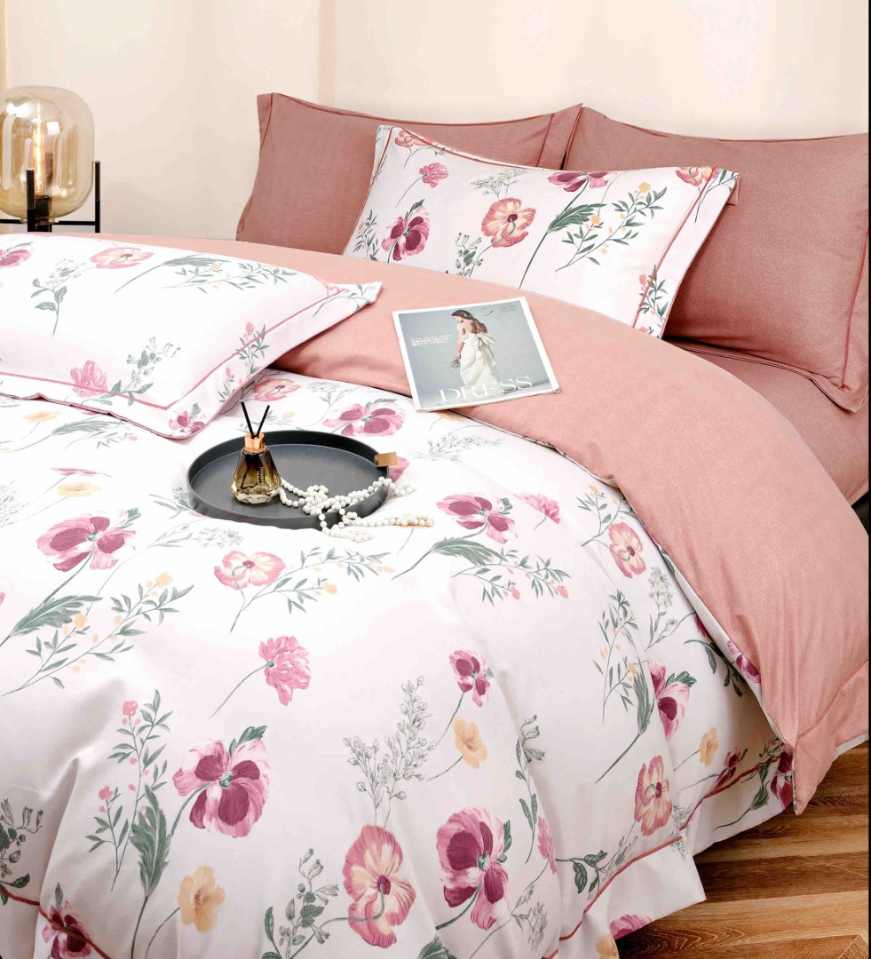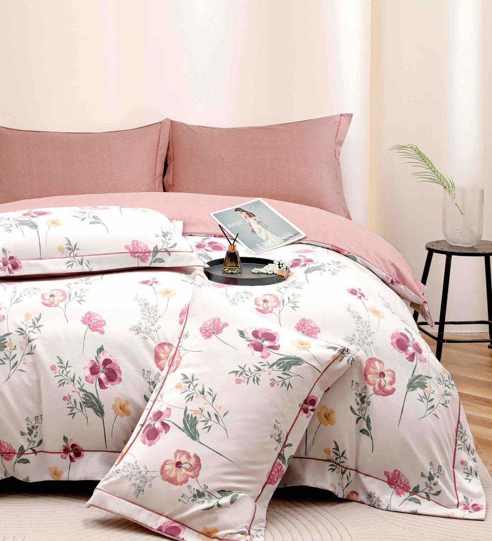 Lenjerie pat dublu, FINET DeLuxe, 6 piese, cu ELASTIC, Jojo Home, Cutie Eleganta, Alb, Roz, Flori