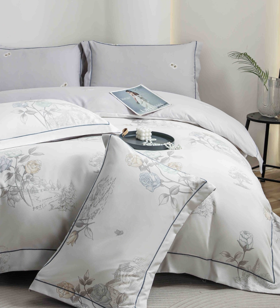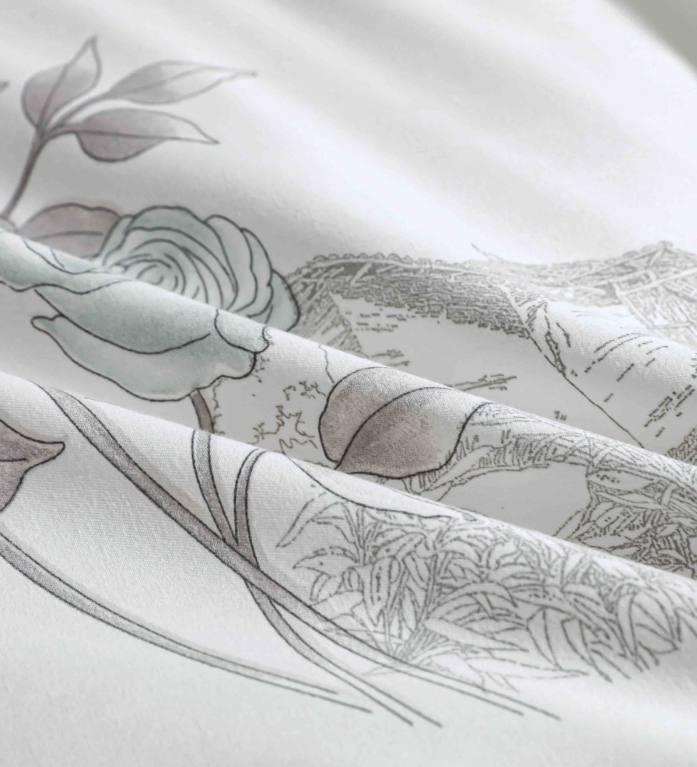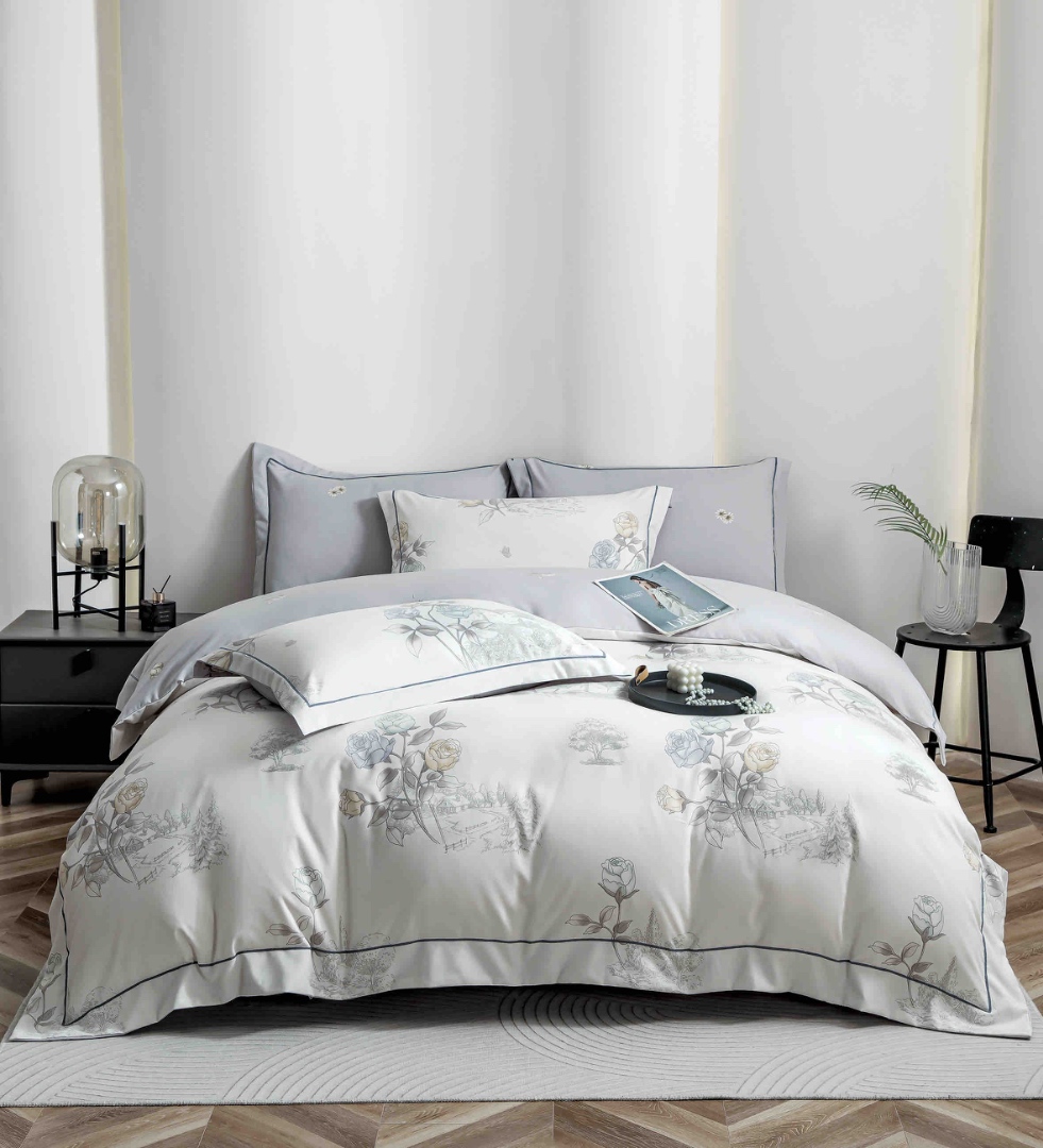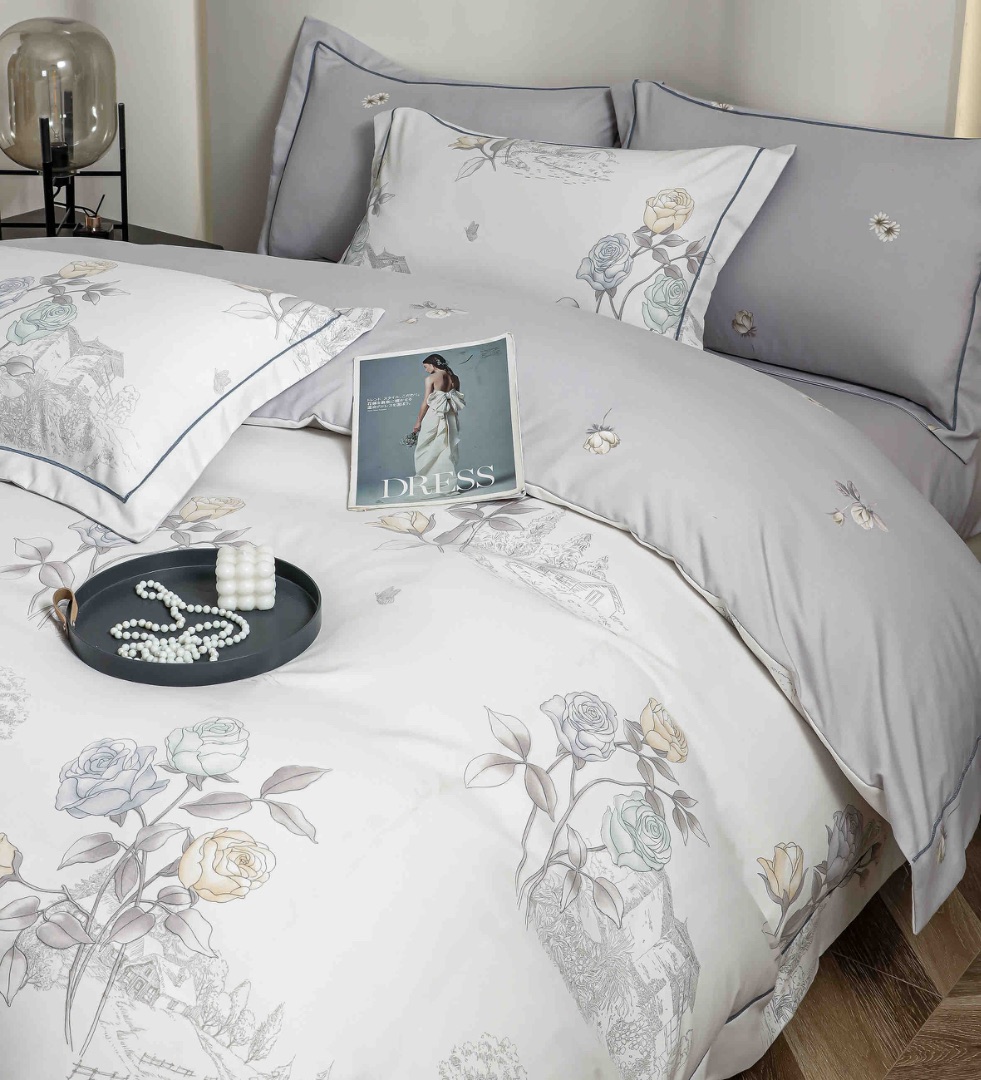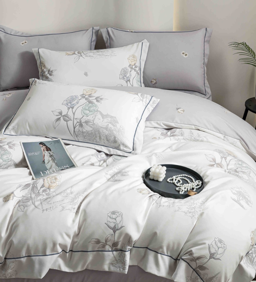 Lenjerie pat dublu, FINET DeLuxe, 6 piese, cu ELASTIC, Jojo Home, Cutie Eleganta, Gri, Flori