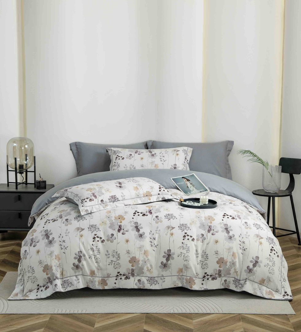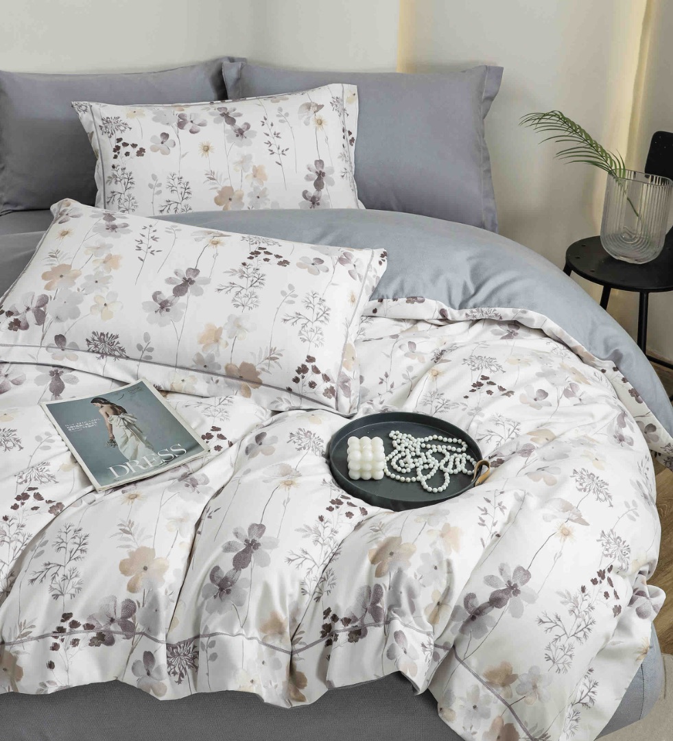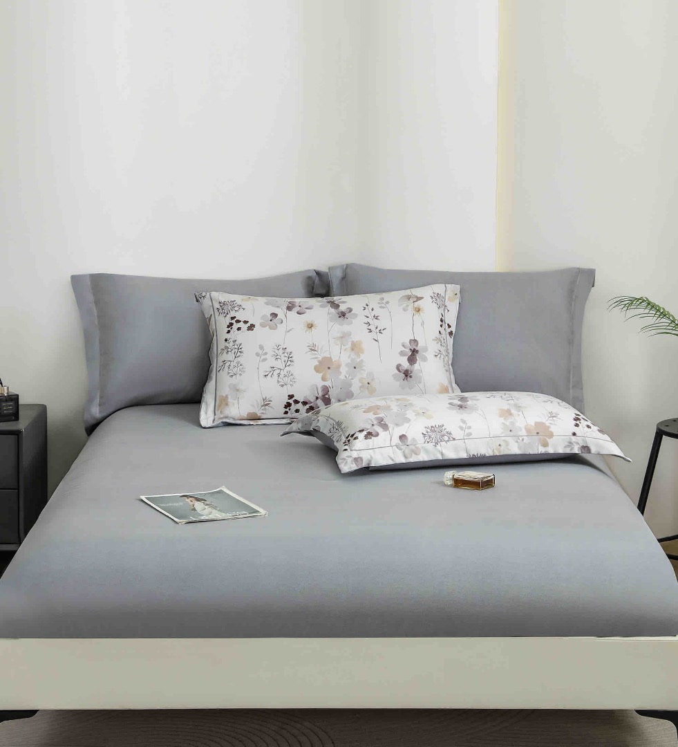 Lenjerie pat dublu, FINET DeLuxe, 6 piese, cu ELASTIC, Jojo Home, Cutie Eleganta, Gri, Flori