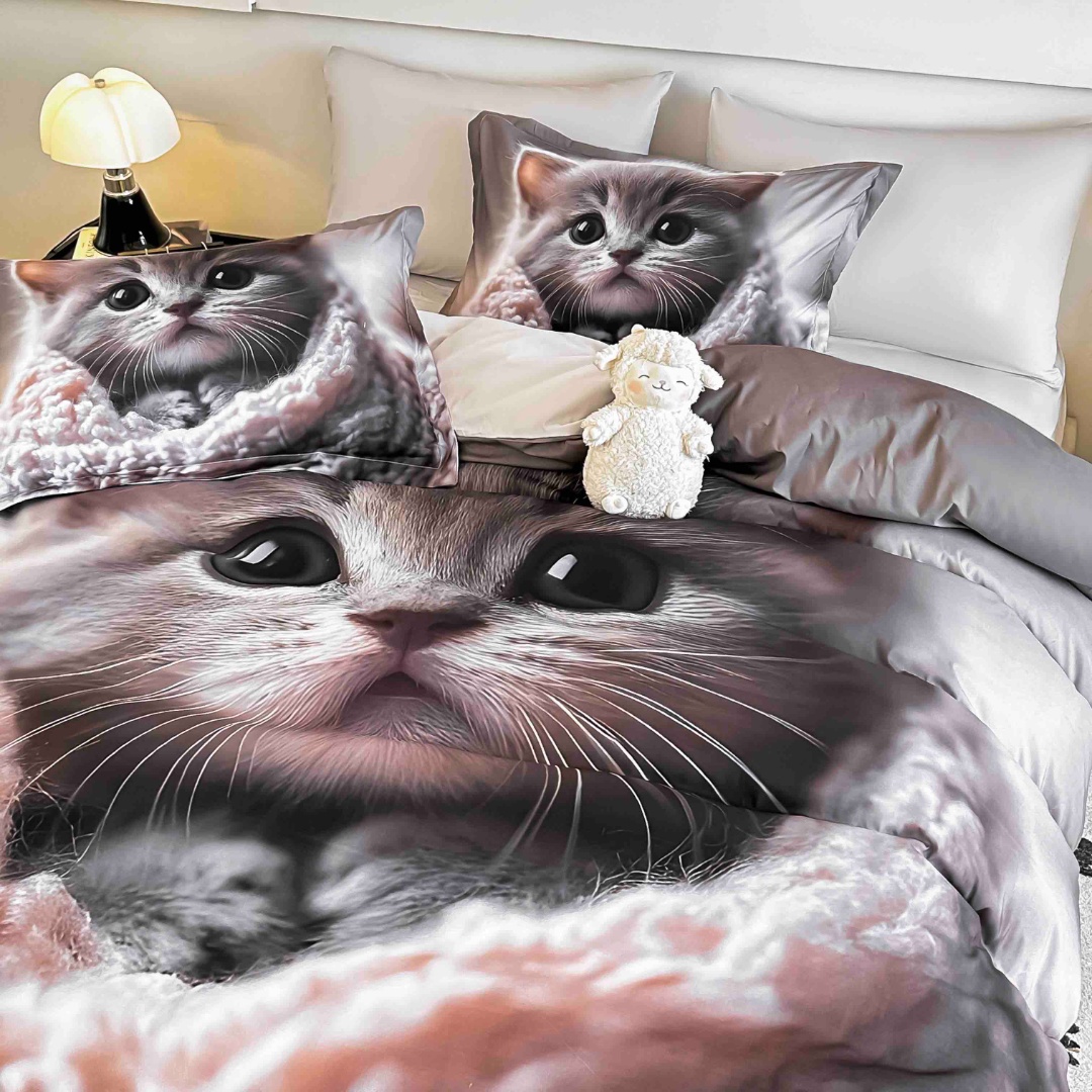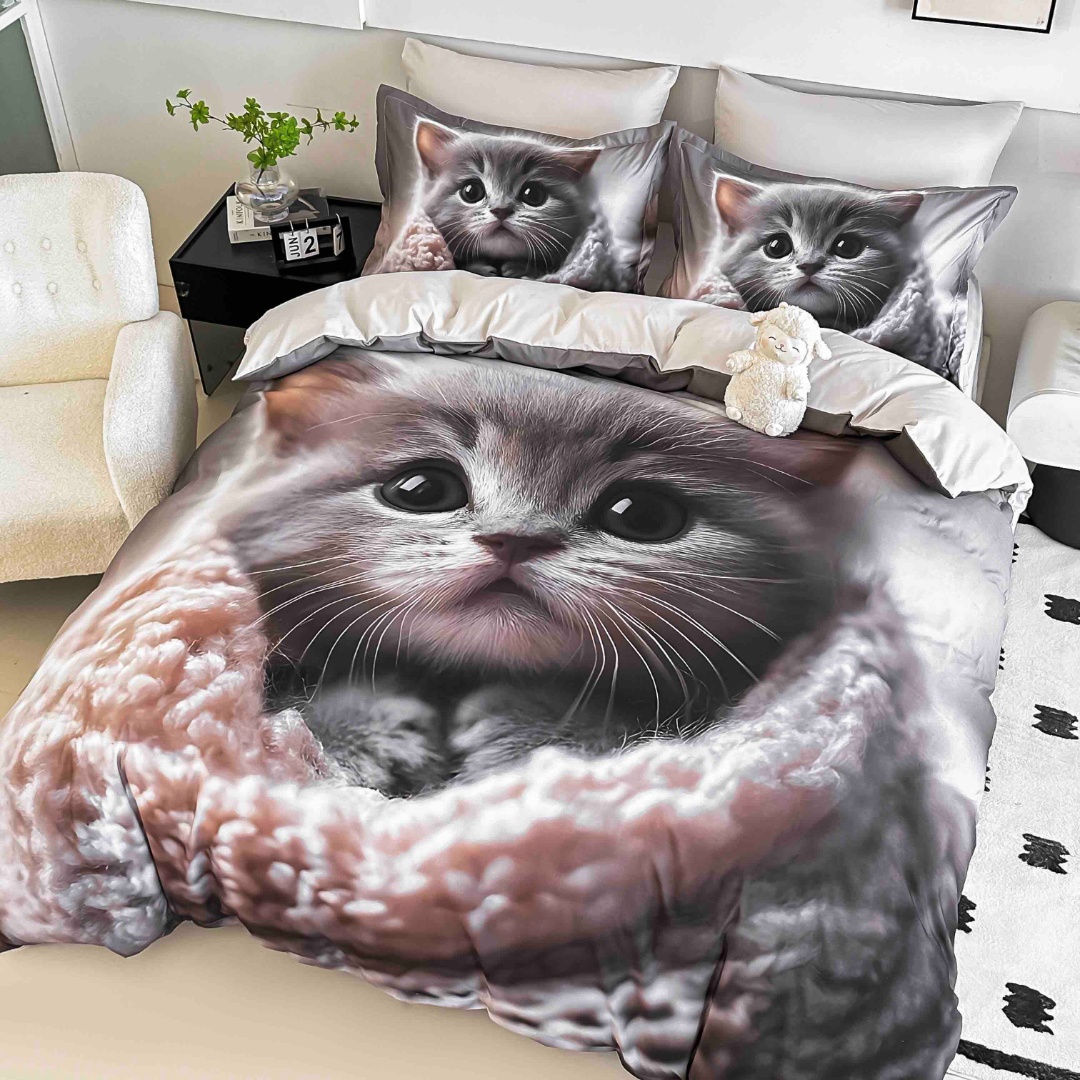 Lenjerie pat dublu, FINET, Imprimeu Digital 5D - Identic cu poza, Cu ELASTIC, 6 piese, Jojo Home, Gri, Pisicuta