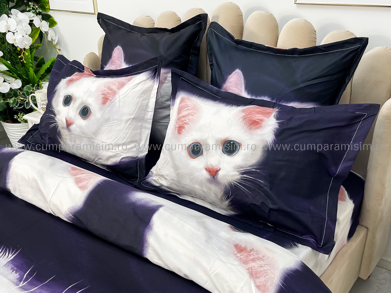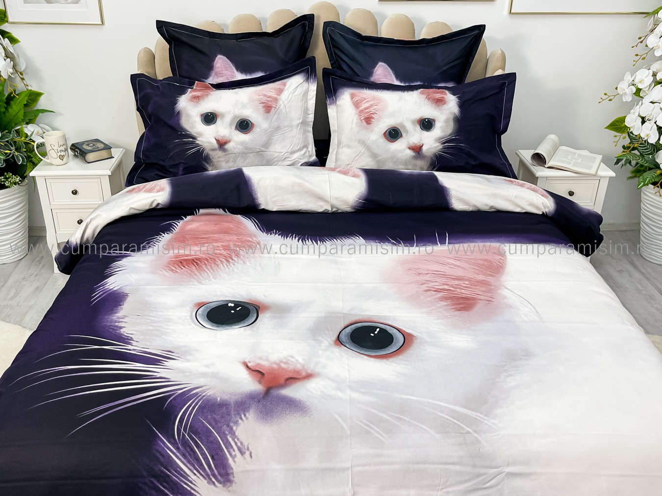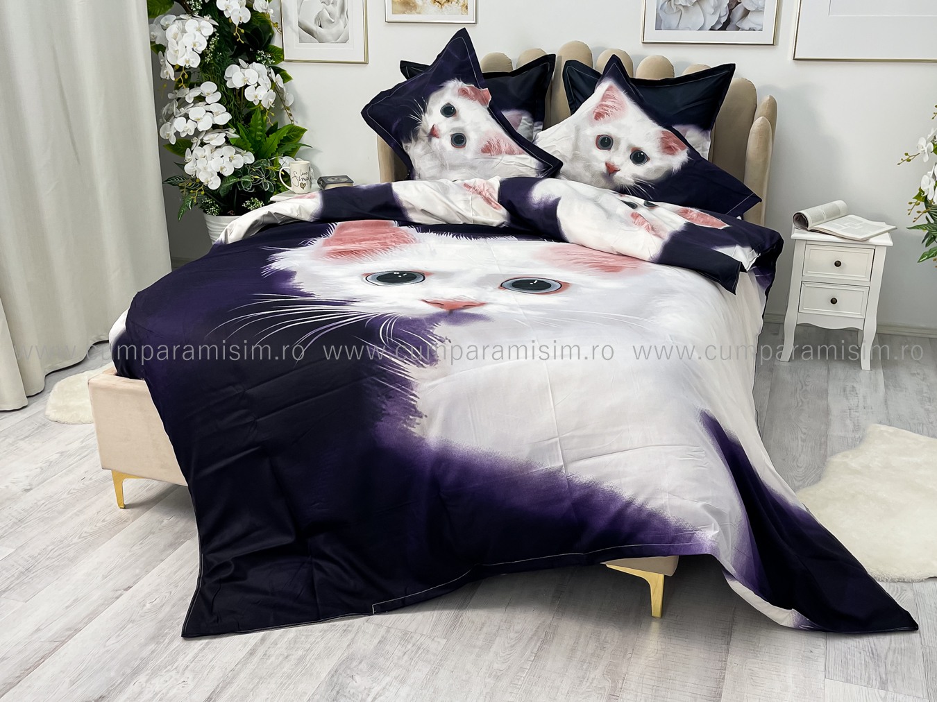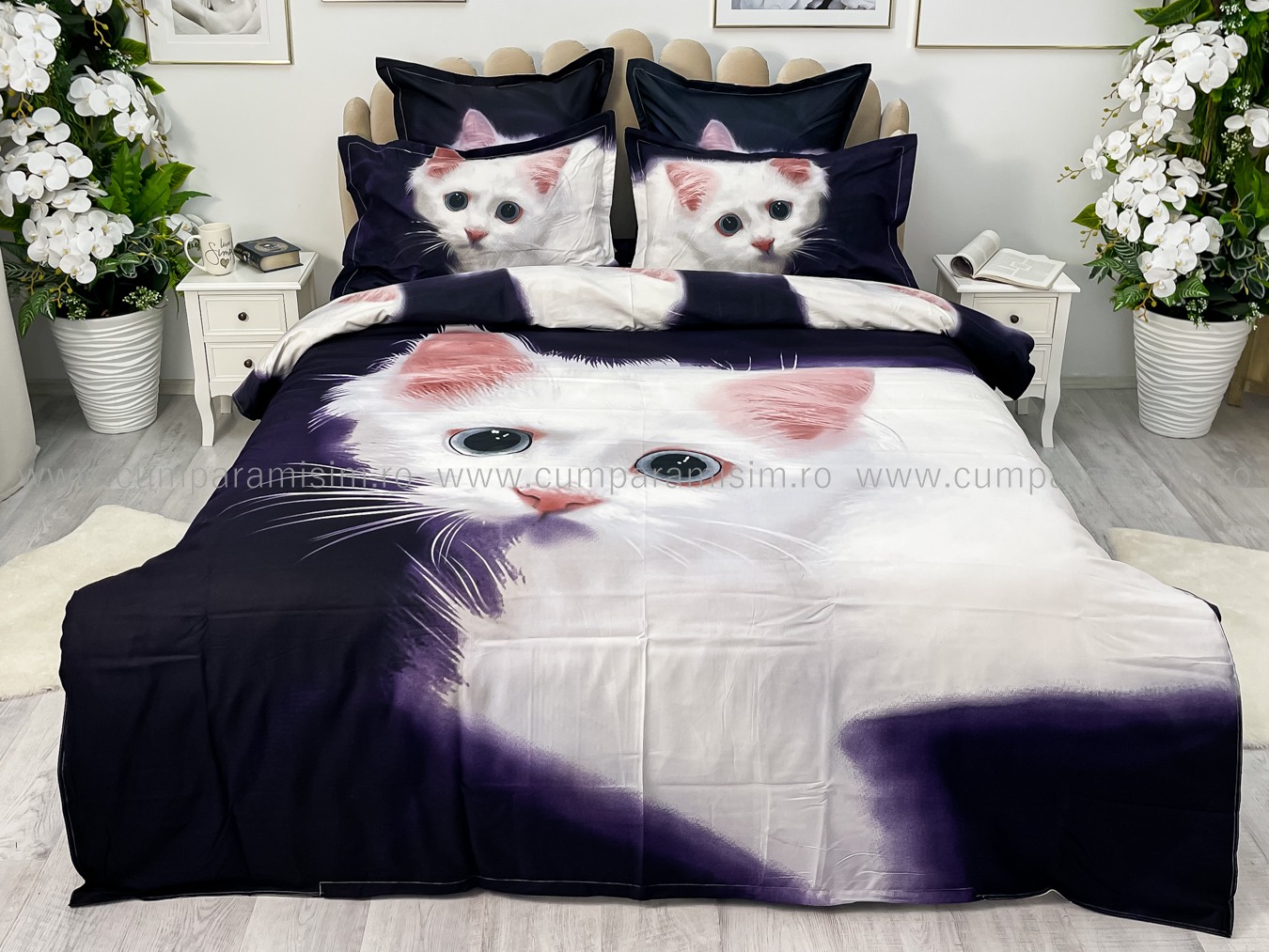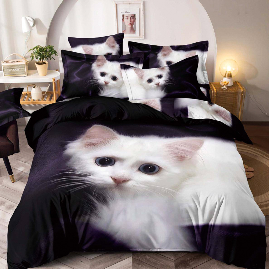 Lenjerie pat dublu, FINET, Imprimeu Digital - Identic cu poza, 6 piese, Jojo Home, Bleumarin-Alb, pisicuta