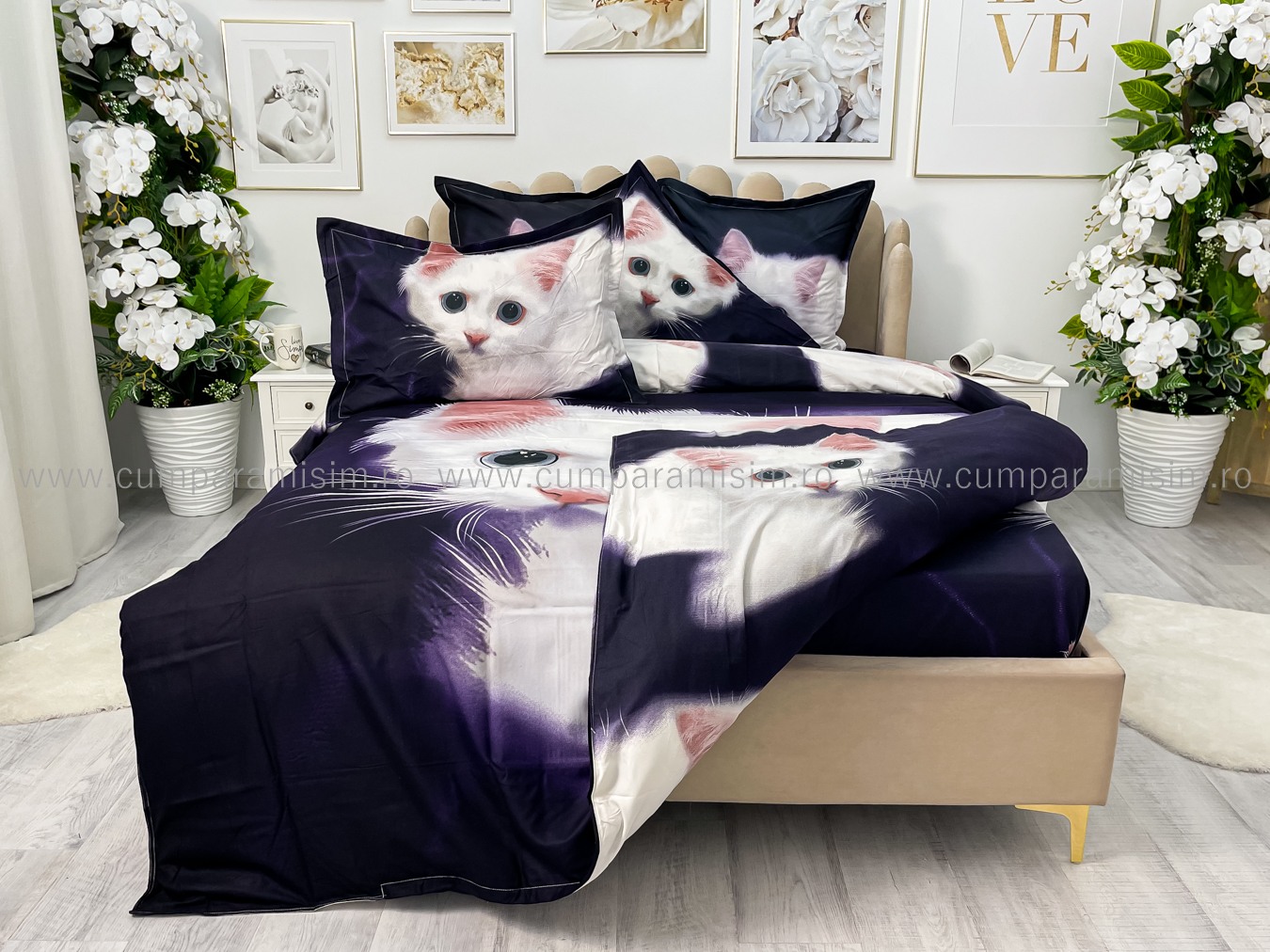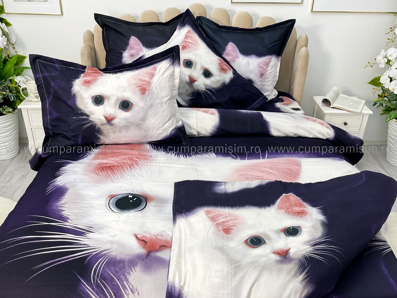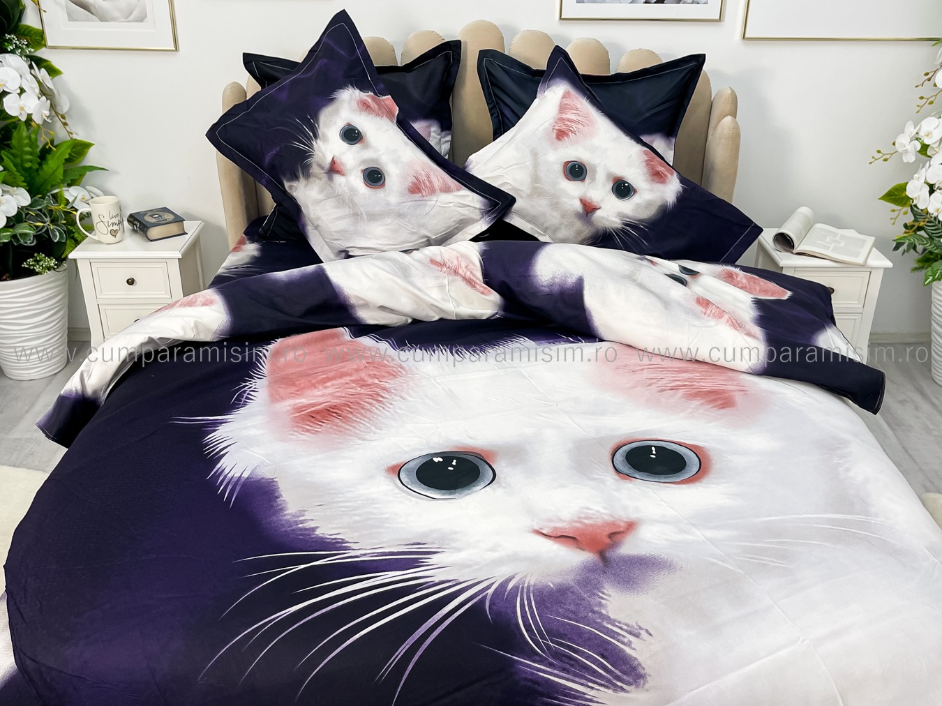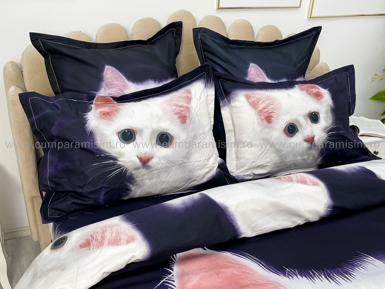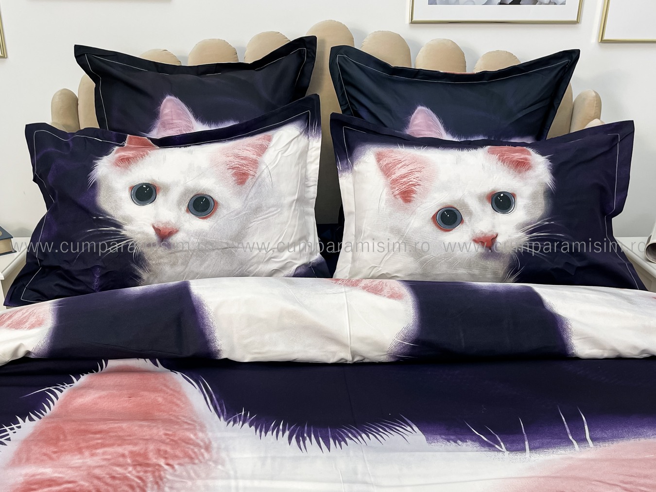 Lenjerie pat dublu, FINET, Imprimeu Digital - Identic cu poza, 6 piese, Jojo Home, Bleumarin-Alb, pisicuta