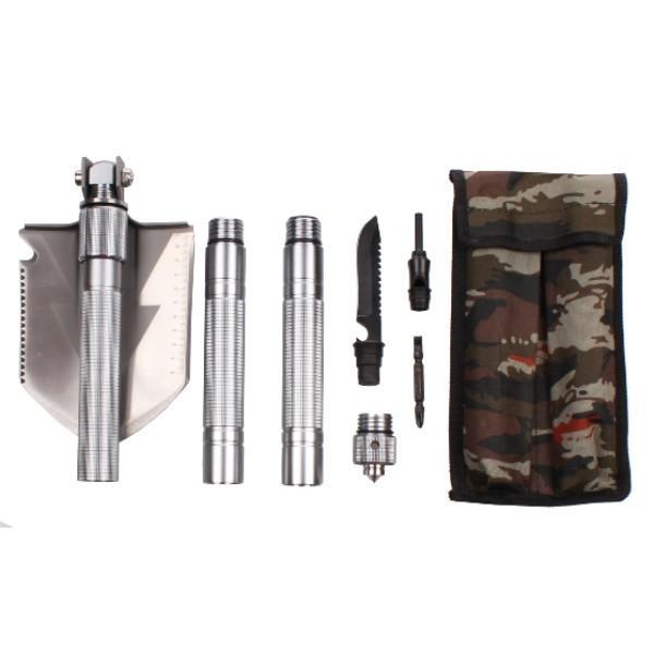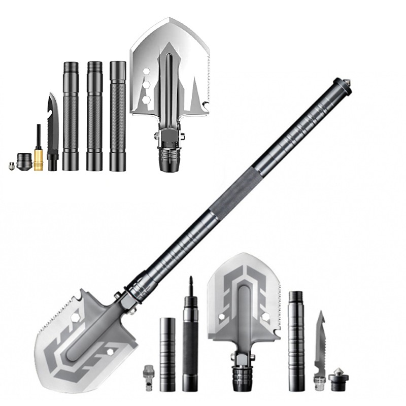lopata pliabila multifunctionala Merco Scout Sapa tip expeditie/supravietuire Lopata multifunctionala este excelenta pentru camping, expeditii cercetase sau poate fi folosita in gradina. Lopata multifunctionala Scout este fabricata din otel, manerul are o suprafata zimtata pentru o mai buna prindere. Lopata este multifunctionala, deoarece ofera diverse modificari. Capul lopetii este imbogatit cu un ferastrau, deschizator de sticle, topor, metru cu o valoare de pana la zece centimetri. Lopata este reglabila cu 180 de grade, ceea ce permite folosirea lamei ca sapa. Manerul lopetii este impartit in trei parti, pe care le desurubati pur si simplu. In maner veti gasi un cutit tactic, o surubelnita, un fluier si un silex / amnar pentru foc. Capatul manerului ofera un varf metalic pentru spargerea de urgenta a geamului. Intreaga lopata multifunctionala este pliata intr-un pachet cu model de camuflaj. Produsul este potrivit pentru persoane de la 18 ani sau cu supravegherea unui adult. Latimea cap lopata: 12,5 cm Lungimea cap lopata: 16 cm Lungime totala lopata: 78 cm