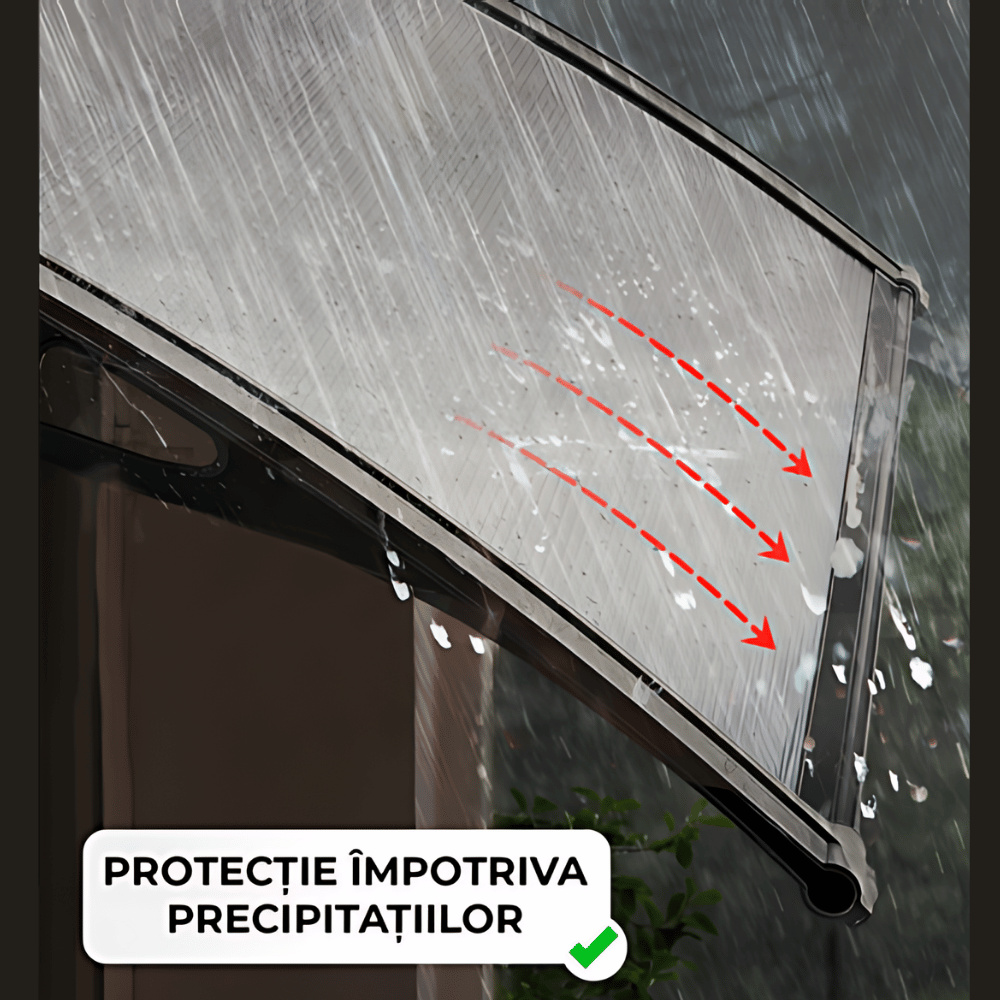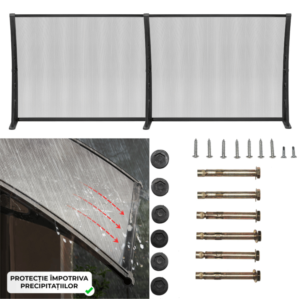 Aceasta copertina de usa de calitate superioara nu numai ca va infrumuseta aspectul proprietatii dvs., dar va proteja si usa sau fereastra de precipitatii, fara a bloca lumina. Poate fi utilizata in aplicatii atat rezidentiale, cat si comerciale. Placile din policarbonat goale pe interior, de calitate superioara, sunt foarte durabile si rezistente la intemperii si coroziune. Constructia solida cu suporturi de plastic solide este foarte stabila. Toate accesoriile necesare pentru asamblare sunt incluse pentru o montare rapida si usoara. Retineti ca acoperisul usii nu poate rezista ninsorilor abundente. Specificatii: Culoare: Suporturi negre si placi transparente Inalțime brat suport: 27 cm Latime brat suport: 6 cm Dimensiuni: 240 x 100 cm (L x l) Grosime placa: 5 mm Material: Placi din policarbonat + brate de sustinere din ABS negru + benzi din aluminiu Include toate accesoriile de asamblare.