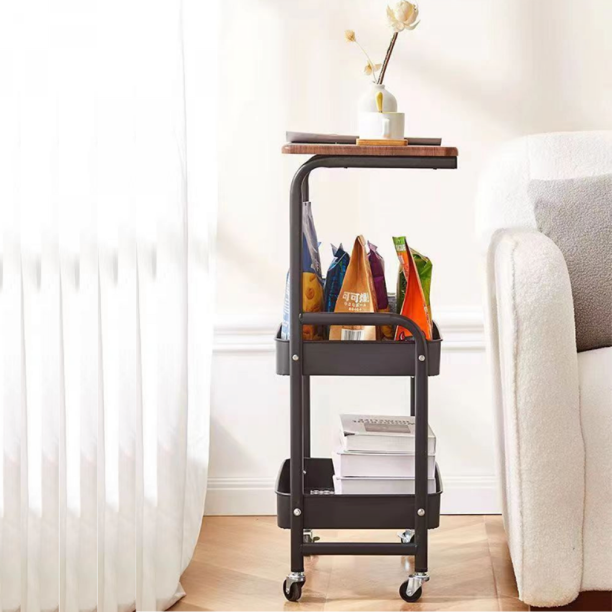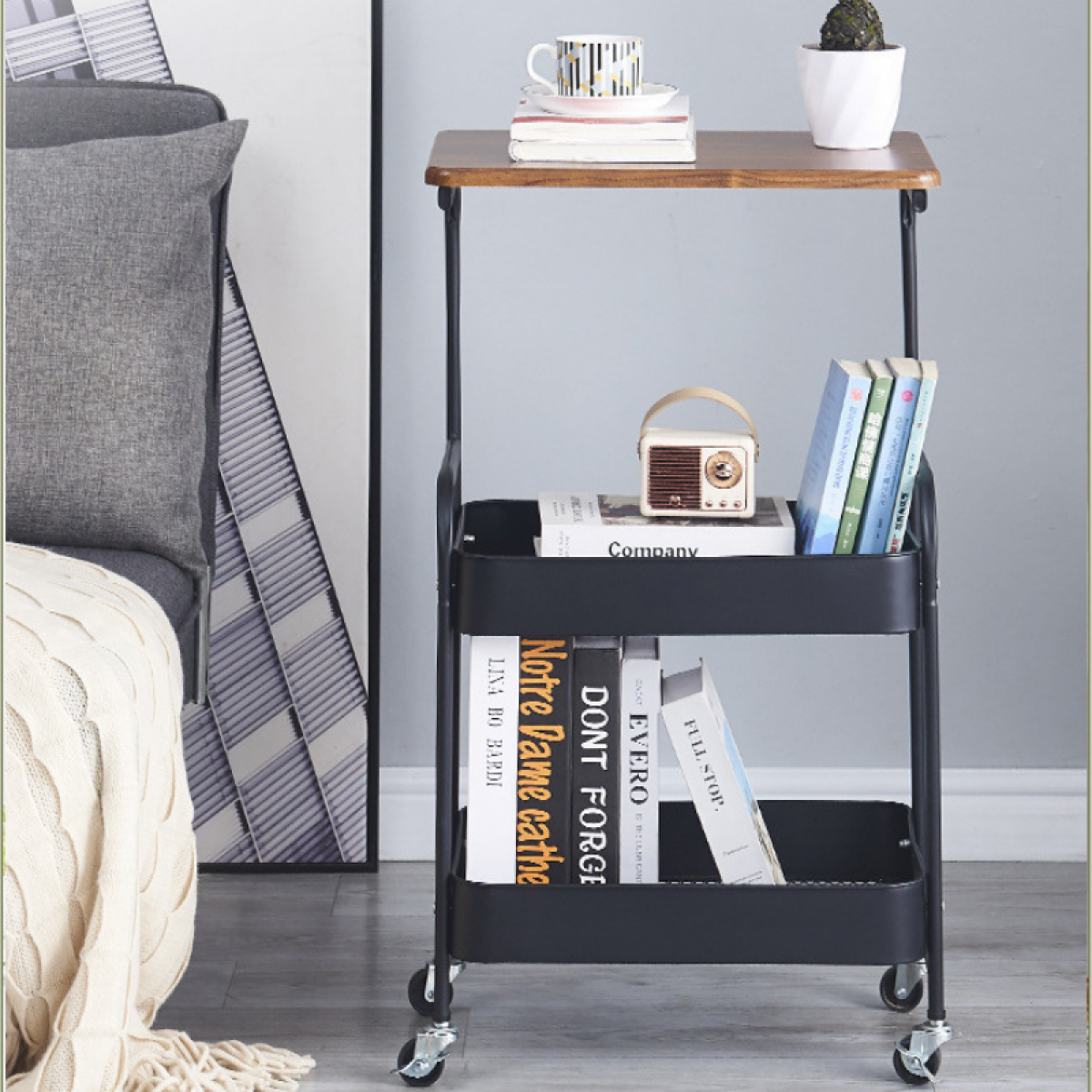 Masuta mobila 2 polite Dimensiune 79 x 43 x 30 cm, Negru Proiectat cu un design modern si ergonomic ce se poate integra cu usurinta cu decorul fiecarei case. Mobilitate oferita de cele 4 rotile rotative 360° rezistente si dotate cu functie de franare. Toata structura + cele 2 polite sunt confectionate din otel de carbon ce pot acomoda diverse articole (carti, articole de baie, bauturi, snackuri etc.). Polita de sus este de tip masa si e confectionata din lemn. Dimensiuni potrivite pentru locurile unde spatiul este limitat. 79 cm Inaltime x 43 cm Lungime x 30 cm latime.