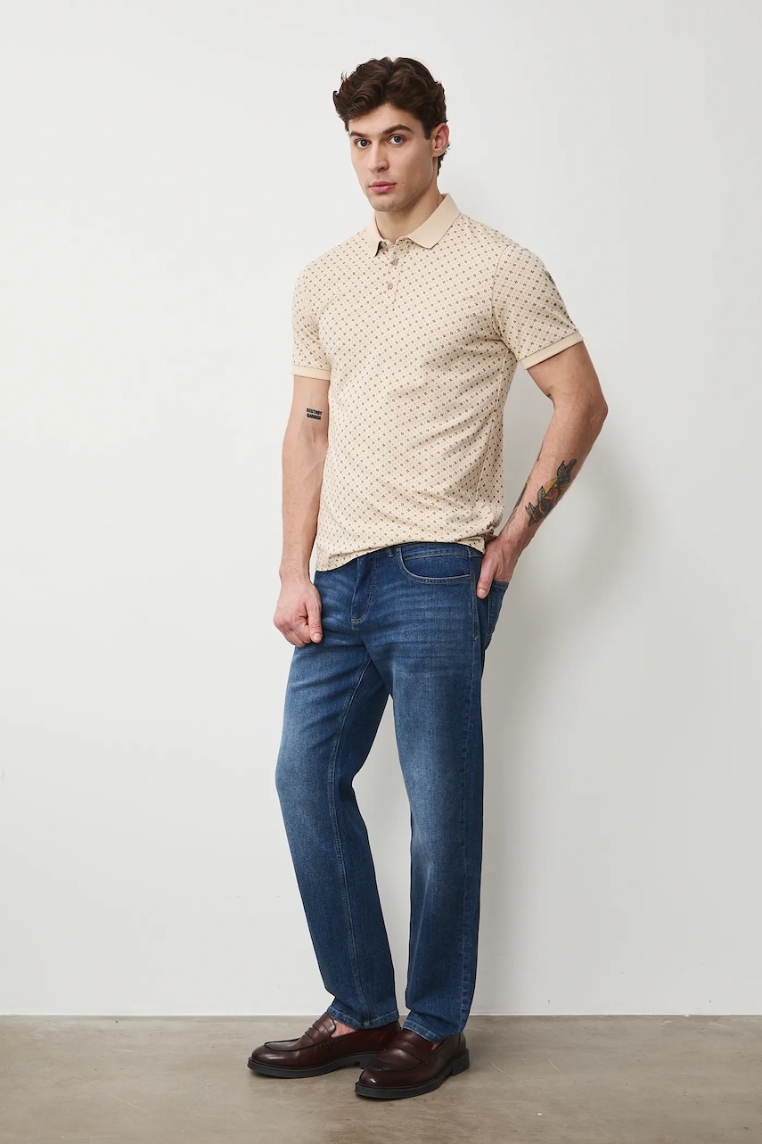 - Fason slim. - Maneca scurta. - Model cu guler. - Incheiere scurta cu nasturi. - Țesătură tricotată cu un model mic. - Lungimea: 71 cm. - Latimea pieptului: 51,5 cm. - Dimensiunile date pentru marimea: M.