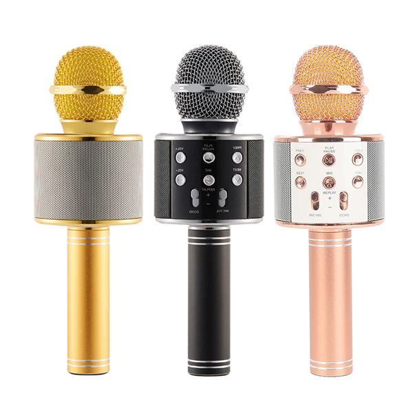 Microfon karaoke fara fir Wireless Bluetooth WS-858 microfon karaoke fara fir WS-858 compatibil iOS si android, tablete iPad si PC, bluetooth. butoane pentru ajustare: Inalte / Bass / Volum / Pr / Reverb; microfon bluetooth fara fir, 2 in 1, fara fire aditionale; capul microfonului are trei functii de reducere a zgomotului, pentru a evidentia vocea; compatibil iOS si android, tablete iPad si PC, bluetooth, etc.; functii multiple: boxa bluetooth, karaoke, audio, inregistrare muzica, interviuri, podcast-uri si asa mai departe; Specificatii microfon karaoke wireless: putere iesire: 5 W; frecventa: 100 Hz- 10 kHz; sunet maxim: 115 dB; baterie 1800 mAh; autonomie: 6 ore; incarcare: DC 5V; culoare: Auriu / Negru / Roz Caracteristici generale: Microfon Karaoke Wireless: Da Baterie incorporata Capul microfonului are trei functii de reducere a zgomotului, pentru a evidentia vocea Compatibil iOS si android, tablete iPad si PC, bluetooth, etc.