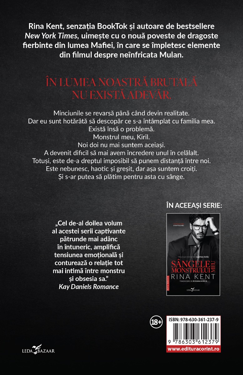 #html-body [data-pb-style=Y5V2639]{justify-content:flex-start;display:flex;flex-direction:column;background-position:left top;background-size:cover;background-repeat:no-repeat;background-attachment:scroll}ÎN LUMEA NOASTRĂ BRUTALĂ NU EXISTĂ ADEVĂR. Minciunile se revarsă până când devin realitate. Dar eu sunt hotărâtă să descopăr ce s-a întâmplat cu familia mea. Există însă o problemă. Monstrul meu, Kiril. Noi doi nu mai suntem aceiași. A devenit dificil să mai avem încredere unul în celălalt. Totuși, este de-a dreptul imposibil să punem distanță între noi. Este nebunesc, haotic și greșit, dar așa suntem croiți. Și s-ar putea să plătim pentru asta cu sânge. „Cel de-al doilea volum al acestei serii captivante pătrunde mai adânc în întuneric, amplifică tensiunea emoțională și conturează o relație tot mai intimă între monstru și obsesia sa.” Kay Daniels Romance „Finalul este devastator: răsturnări de situație peste răsturnări de situație, toate culminând cu o inimă frântă. Aproape că m-a distrus!” The Abstract Books Blog „Această carte m-a făcut să trec prin toate emoțiile posibile. Vulnerabilitatea Sașei, încăpățânarea ei, durerea ei – totul a fost brutal de real. Iar Kiril? Frustrant de misterios, și totuși e imposibil să nu-l iubești. Pasiunea dintre ei produce haos și nebunie, exact așa cum trebuie.” Trilogy of Romance „Finalul deschis m-a luat prin surprindere și abia aștept să descopăr cum se vor lega toate lucrurile mai departe!” I Like Books Best