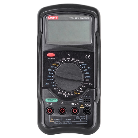 Multimetru digital, tip UT 51. Tensiune continua: 200mV / 2V / 20V / 200V / 1000V ± (0, 5% + 1) Tensiune alternativa: 200mV / 2V / 20V / 200V / 750V ± (0, 8% + 3) Curent continuu: 20 µA / 200 µA / 2 mA / 20 mA / 200 mA / 2 A / 10 A ± (0, 8% + 1) Curent alternativ: 200 µA / 2 mA / 20 mA / 200 mA / 2 A / 10 A ± (1% + 3) Rezistenta: 200 Ohm / 2 kOhm / 20 kOhm / 200 kOhm / 2 MOhm / 20 MOhm / 200 MOhm ± (0, 8% + 1) Testare diode Masurarea factorului de amplificare al tranzistoarelor, hFE Verificarea continuitatii Schimbarea manuala a domeniilor de masurare Indicator de baterie descarcata Impedanta de intrare DC: aproximativ 10 MOhm Alimentare: baterie de 9V (6F22) Dimensiunea afisajului: 33 x 65 mm Dimensiuni produs: 190 x 88 x 34 mm Greutatea produsului: 560 g Accesorii: baterie, cabluri de testare