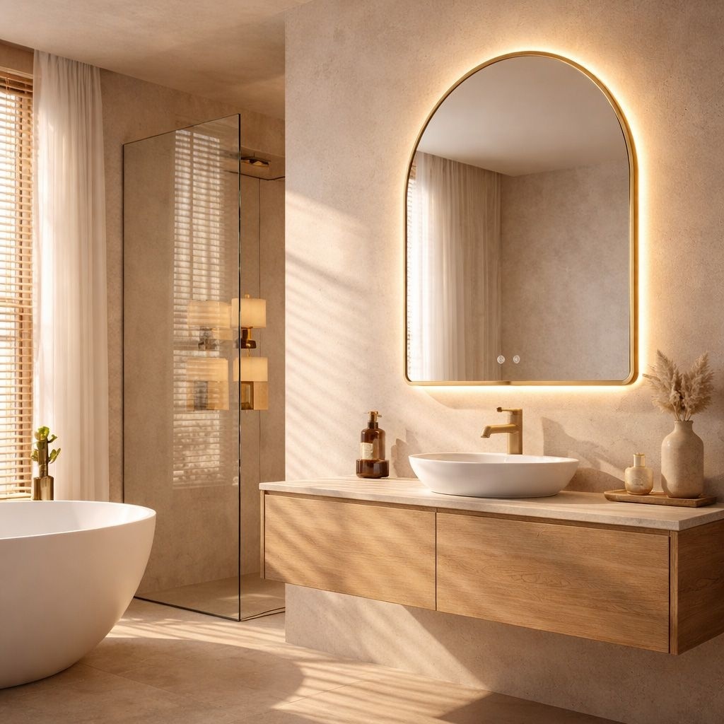 Oglinda de baie LED Camlot cu dimensiunile 80×60 cm este o combinație elegantă între forma clasică de arc și tehnologia modernă de iluminare. Rama aurie distinctivă, cu finisaj periat, oferă interiorului un caracter luxos, transformând oglinda în punctul decorativ central al oricărei băi stilate.Formă subtilă de arc (Arch) – marginea superioară rotunjită a oglinzii introduce delicatețe și armonie în interior, spărgând liniile drepte ale mobilierului de baie tradițional.Ramă în culoarea aurului periat – carcasa solidă, cu o îmbinare estetică în partea de jos a oglinzii, subliniază aspectul prestigios al produsului. Structura periată este mată și elegantă, mascând perfect micile urme de utilizare.Lumină caldă cu funcție de reglare a intensității – iluminarea LED integrată emite o lumină caldă, plăcută, care creează o atmosferă primitoare. Sistemul intuitiv permite reglarea fluidă a luminozității, adaptând intensitatea strălucirii nevoilor dumneavoastră.Sistem Anti-Fog (Covoraș încălzitor) – funcția de încălzire a oglinzii previne eficient aburirea acesteia, asigurând o reflexie clară chiar și imediat după o baie sau un duș fierbinte.Control tactil – două butoane iluminate, plasate în partea de jos a oglinzii, permit gestionarea confortabilă a iluminării și a funcției anti-aburire cu o singură atingere.Gata de conectare – oglinda este echipată cu un cablu cu ștecher, ceea ce permite instalarea rapidă și conectarea la o priză electrică standard, fără a fi necesară modificarea instalației.Alegând oglinda LED Camlot 80×60 cm în ramă aurie, optați pentru o estetică deosebită și funcționalitate zilnică. Este o propunere ideală pentru băile în stil modern, glamour și art déco, unde contează fiecare detaliu și calitatea înaltă a execuției. Inalime: 800 Latime : 600 Adâncime: 20 Iluminare LED: Iluminare LED Ramă: Ramă Culoarea ramei: Auriu periat Materialul ramei: Metal Formă: Dreptunghiular Anti-aburire: Anti-aburire Model: Top Putere: 12 Garantie: 24 luni