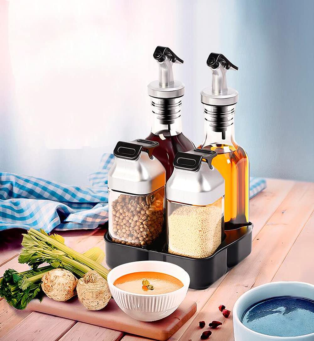 Oliviera cu 4 recipiente si suport Material: sticla, plastic ABS, silicon, otel inoxidabil. Pachetul include: 1 x recipient 90 ml sare 1 x recipient 90 ml piper 1 x 175 ml dozator de ulei 1 x 175 ml dozator de otet 1 x suport tip tavita