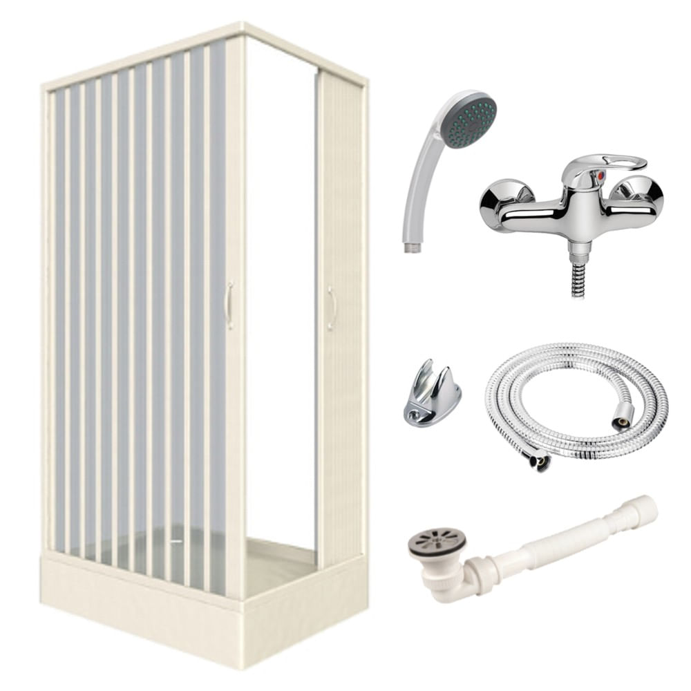 Pachet complet pentru echiparea baii cu cabina de dus dreptunghiulara cu doua laturi./nPachetul contine: /nCabina de dus Luana 80100, cabina dreptunghiulara din PVC cu usi care se pliaza armonic, dimensiuni 80x100x185cm;/n Cadita de dus dreptunghiulara din acril, dimensiuni 80x100x17 cm;/n Sifon de scurgere 1”1/2, cu iesire de Ø40-50;/n Baterie de dus completa cu furtun si para de dus./n