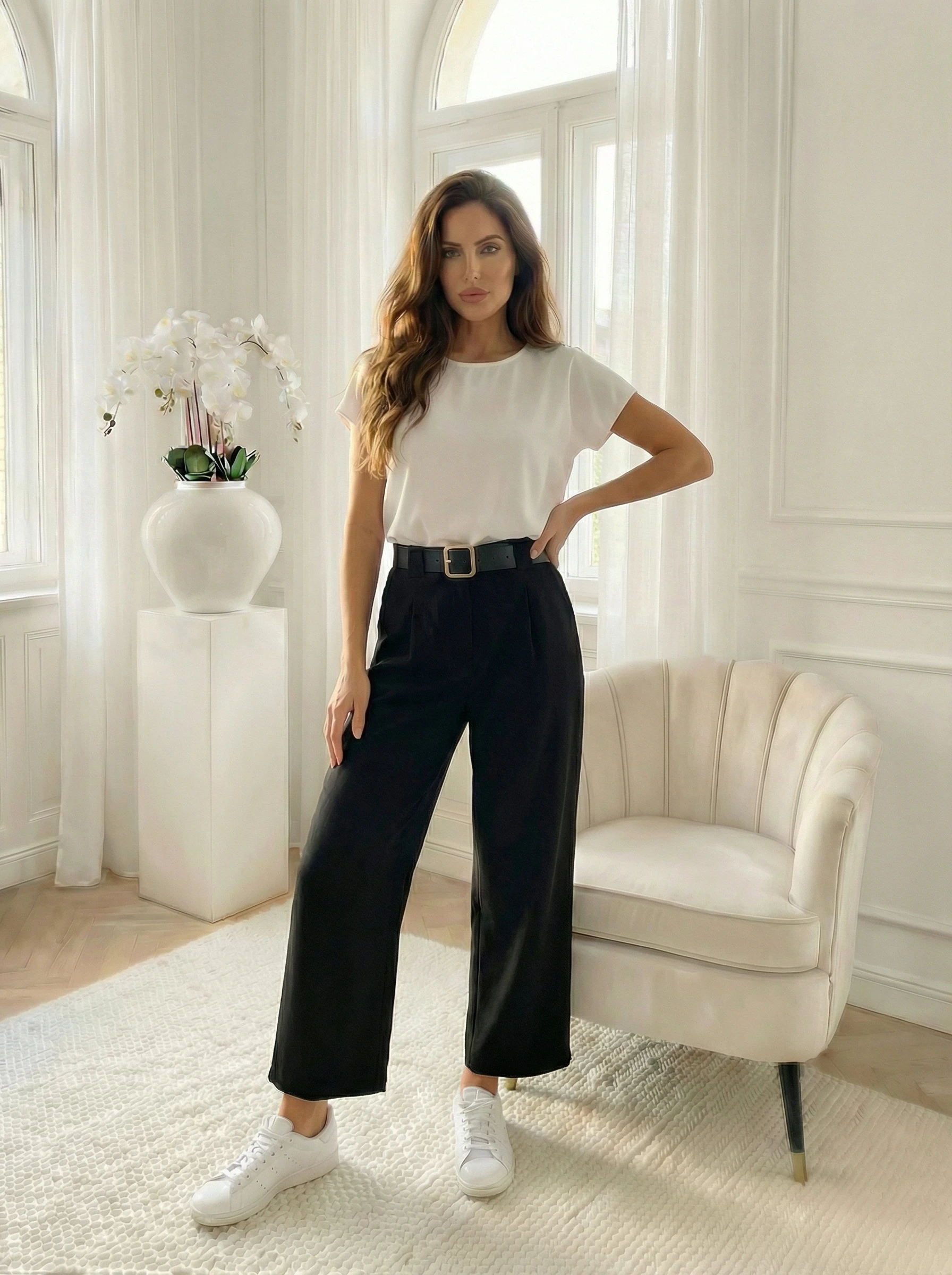 Pantaloni negri lejeri cu curea si talie elastica ofera un confort sporit pe tot parcursul zilei. Realizati dintr-un material dens care nu se sifoneaza usor, acesti pantaloni sunt prevazuti cu o curea eleganta in talie care accentueaza formele feminine in