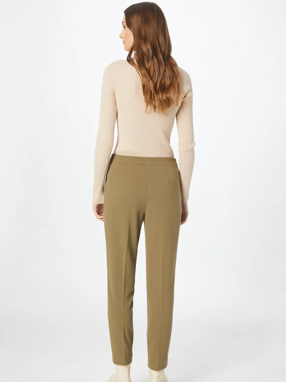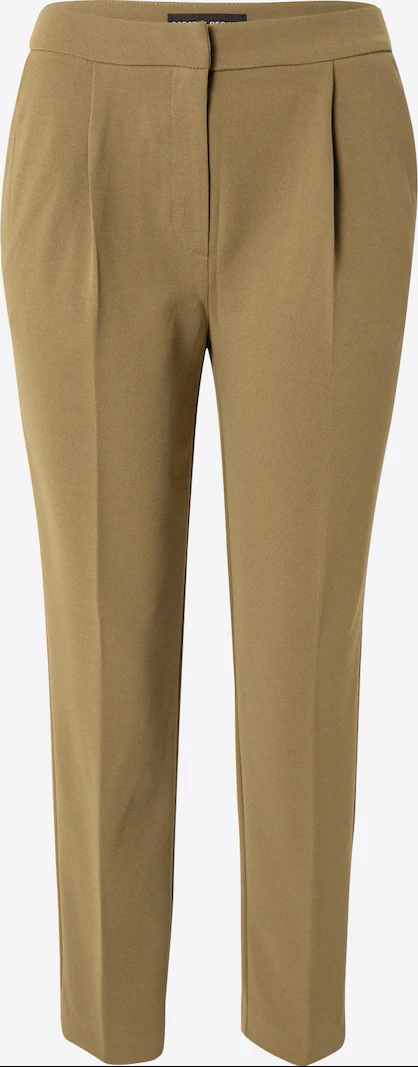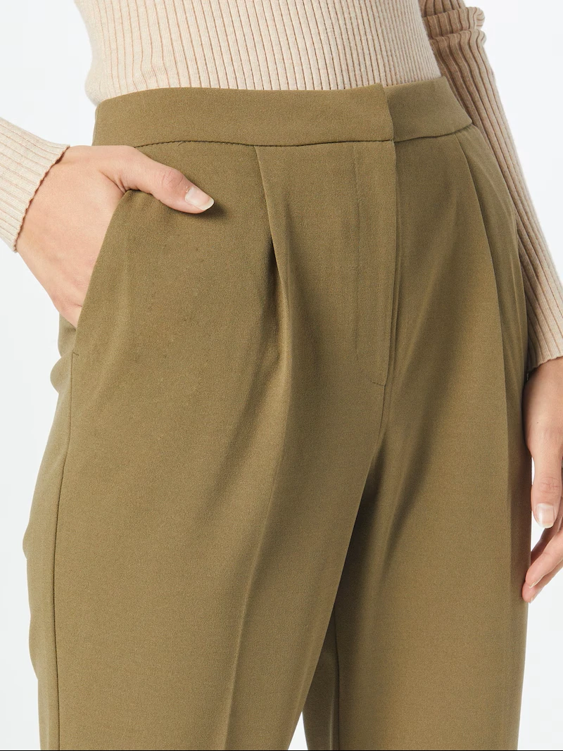 Pantaloni office olive cu talie inalta si pliuri, se remarca prin croiala conica impecabila, completata de pliuri discrete in partea superioara. Talia inalta pune in evidenta silueta intr-un mod elegant, facand acest model usor de asortat cu camasi cambra