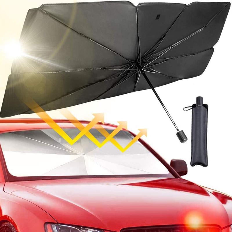 Parasolar pliabil tip umbrela pentru parbrizul masinii Izolare termica si protectie impotriva razelor solare Parasolarul in forma de umbrela pentru parbrizul masinii este protectia ideala impotriva razelor solare, care ajuta inclusiv la reducerea temperaturii in interiorul masinii. Pregatit pentru a fi folosit imediat, parasolarul este comod, usor de depozitat, si pentru fixare, poate fi prins de usile masinii. Veti aprecia acest accesoriu in zilele fierbinti de vara. In puteti folosi totodata si in zilele ploioase, ca si umbrela. Suprafata sa este rezistenta impotriva razelor UV dar si impotriva ploii. Dimensiuni: 80 x 140 cm