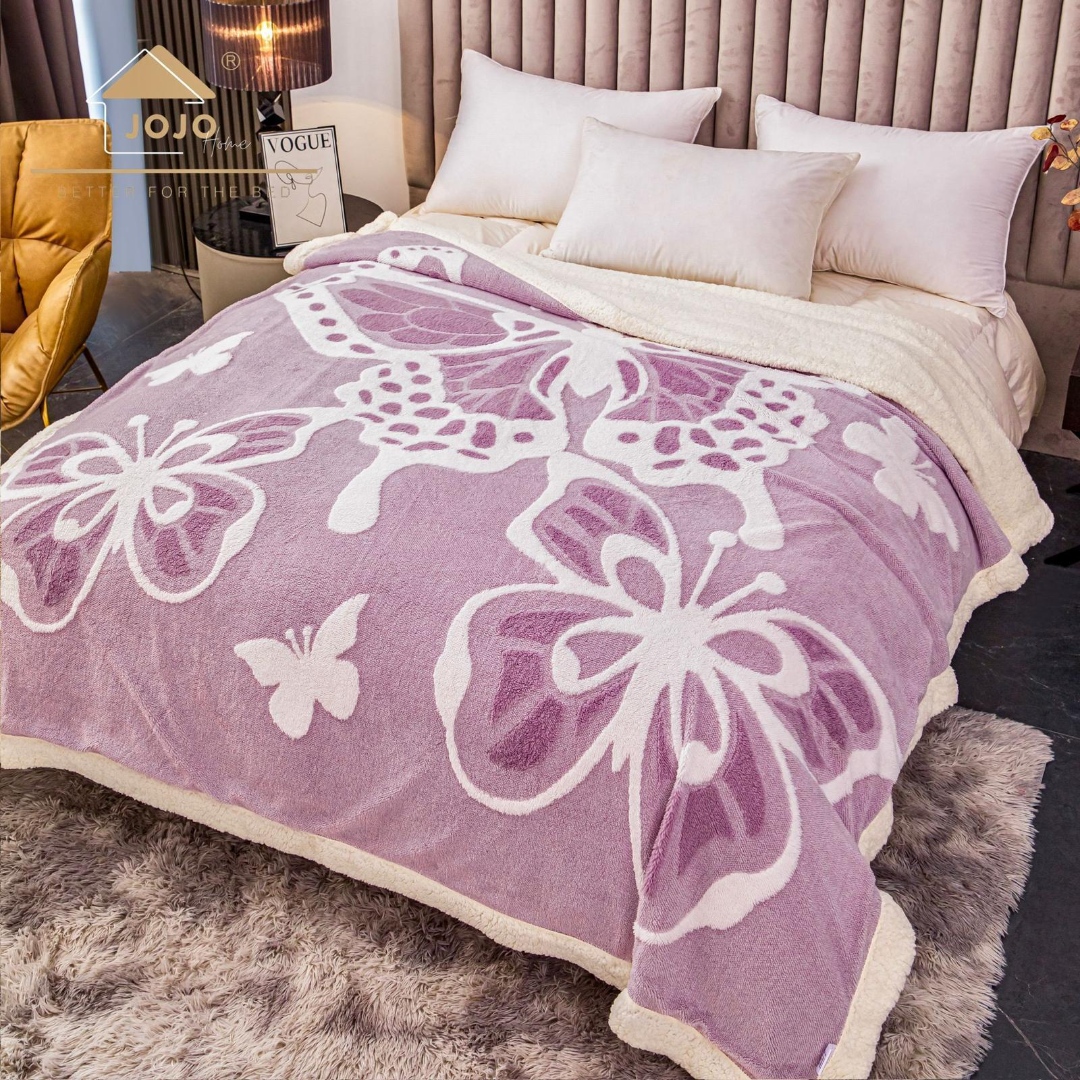 Patura CoCoLiNo cu blanita, 200x230cm, Jojo Home, Lila, Alb, Fluture