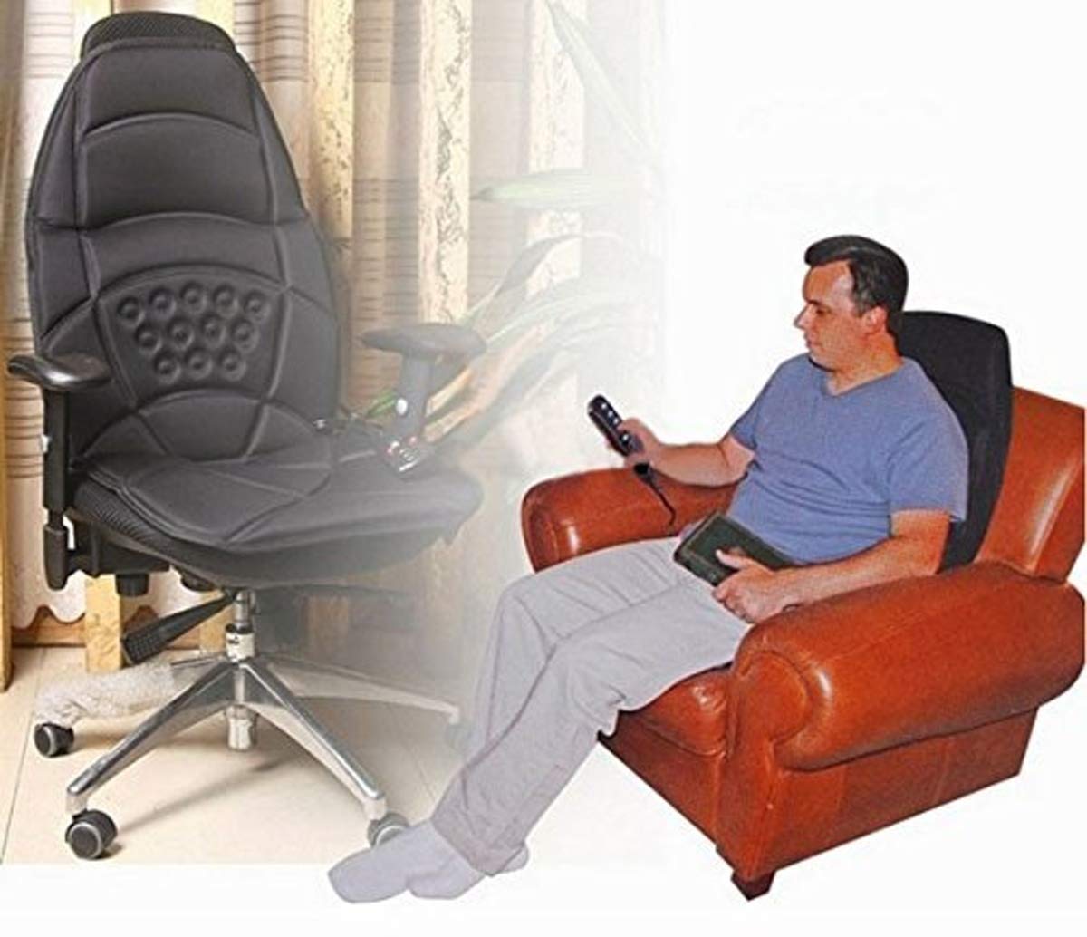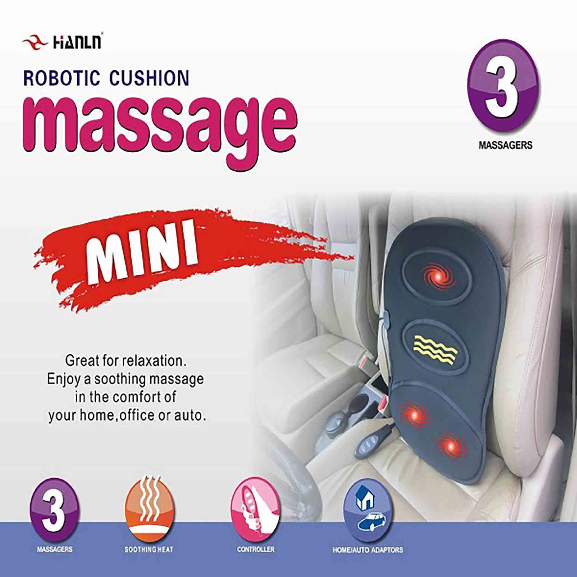 Perna cu 2 zone de masaj si incalzire, pentru scaun auto Mini husa de masaj pentru scaun - Celor care au probleme reumatice si care doresc sa se relaxeze atunci cand sunt la volan le punem la dispozitie mini husa auto cu masaj. Utilizarea zilnica a acestei huse cu masaj va ajuta sa va mentineti tonusul muscular si in plus va bucurati de senzatii placute. Puteti utiliza aceasta husa cand porniti la drum lung, dar si acasa cand va uitati la televizor sau cand cititi o carte. perna robotizata pentru mini masaj in masina, la birou si acasa este ideala pentru utilizarea in masina, acasa sau la birou are caldura infrarosu si masaj vibrator caldura penetranta la lombar 3 motoare de vibratie din interior adaptoare de alimentare pentru acasa si auto 2 zone de masaj: partea superioara a spatelui partea inferioara a spatelui Caracteristici si avantaje: Se poate incarca la bricheta masinii sau la o priza de 220~240V Este usor de transportat si de depozitat datorita dimensiunilor sale reduse Aceasta husa vine insotita de 1 telecomanda ce va permite setarea functiei de masaj dorita. Adaptor bricheta 12 V- 5W Dimensiuni 50×40 cm 4 functii de masare si 3 trepte de intensitate Functie de incalzire