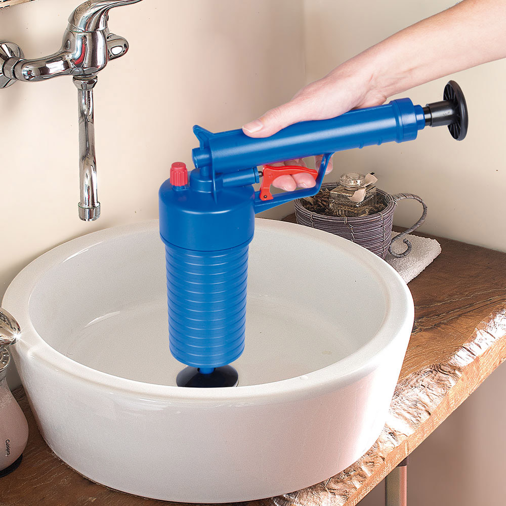 Pistol cu aer comprimat pentru desfundat scurgerile Puternic si practic acest pistol este eficient datorita sistemului cu aer comprimat pe care il are. Astfel puterea si forza sunt mult mai mari. Cu doar 30/35 miscari se produce o presiune similara cu 0,8 MPa, suficienta pentru desfundarea chiuvetelor din baie sau bucatarie. Nu presupune folosirea substantelor chimice, corozive ci foloseste legile fizicii pentru a crea o unda rapida si puternica sufucienta pentru a indeparta obstacolele. Are 4 adaptoare ce permit utilizarea pistolului pe mai multe tipuri de scurgeri: in baie, bucatarie, terasa, etc. Pistolul are o valva de protectie care intra imediat in functiune in cazul unei eventuale suprapresiuni. Este din plastic si cauciuc. Dimensiuni (L x H x P) 28 x 28,5 x 8,5 cm cca. Setul include: Adaptor pt. Wc cca. 20 cm Adaptor pt. dus cca. 11,3 cm 2 Adaptoare pentru chiuvete si bideu cca. 6,3 cm si cca. 5,2 cm