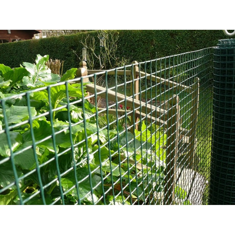 Plasa verde din sarma sudata plastifiata Dimensiune: 0.5 m latime x 10 m lungime Ochi 13 x 13 mm, grosime 1 mm Plasa Sarma Sudata Plastifiata este confectionata din sarma de otel sudata, cu grosimea de 1 mm si imbracata intr-un strat PVC pentru protectie indelungata contra intemperiilor. Utilizare: gradini cotete pasari custi animale mici de curte armare structuri constructii imprejmuiri patule porumb, etc Caracteristici: latime: 0.5 m lungime: 10 m culoare: verde material: metal si PVC arma plastifiata diametru sarma: 1mm dimensiune ochi: 13 x 13 mm (lungime x latime)