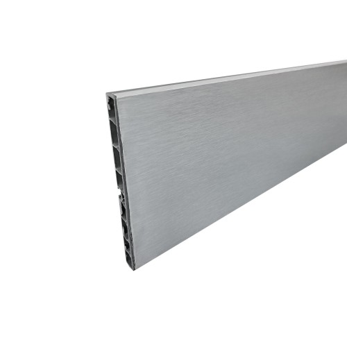 Plinta argintie pentru mascarea picioarelor reglabile de bucatarie Inaltime: 150 mm Lungime: 4000 mm Material: PVC + Aluminiu Se folosesc clemele de prindere plinta pentru fixarea plintei de picioare Pentru imbinari la 90 de grade si la 270 de grade se folosesc imbinari de plinta Pretul este pentru 10 bucati de plinta la 4 metri fiecare
