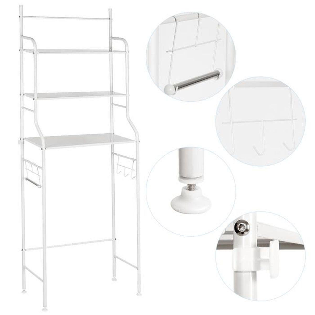 Raft depozitare peste toaleta/masina de spalat, organizator pentru baie Suportul este plasat deasupra toaletei sau masinii de spalat pentru a economisi in mod eficient spatiul din baie si pentru a-l folosi pe deplin. Raftul cu trei compartimente, va poate ajuta sa depozitati eficient obiectele sanitare si va puteti clasifica si plasa in mod eficient articolele. Pe langa cele 3 compartimente vine si cu un carlig pentru hartie igienca si carlige pentru prosoape pe lateral, care se pot si scoate. La picioare are suportidin silicon pentru o stabilitate mai buna, putand chiar si modifica inaltimea si pentru a putea sa il muti cu usurinta. material: otel vopsit inaltime: 165 cm latime: 55 cm adancime baza: 26 cm adancime partea de sus: 18 cm culoare: alb