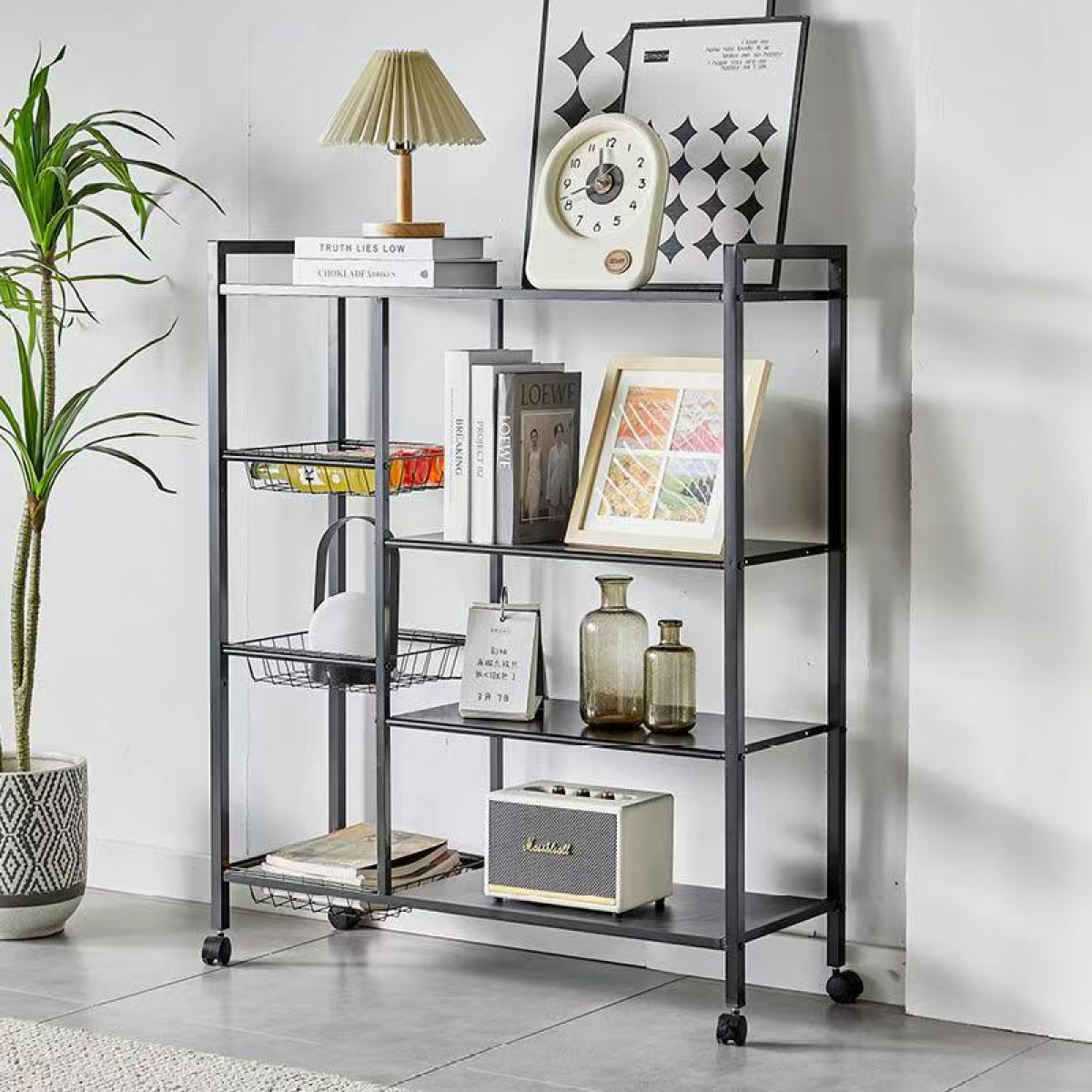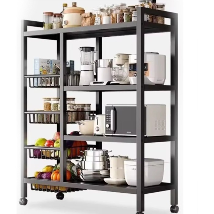 Raft metalic cu 4 polite si 3 cosuri pentru depozitare Ultra Portabil, 90 (L) x 32 (l) x 108 (H) cm, culoare Negru Capacitate mare de depozitare - cu dimensiunile sale generoase (90 (L) x 32 (l) x 108 (H) cm), acest raft poate acomoda diverse electrocasnice, legume/fructe, carti, vase, condimente sau orice alte articole de bucatarie. Structura solida - stabilitatea sporita este asigurata atat de cadrul suportului confectionat integral din metal, cat si de cele 3 cosuri si 4 polite metalice. Raftul poate fi usor transportat - 4 roti rotative 360° Doua dintre rotite sunt dotate cu functie de franare Design modern - se integreaza cu usurinta cu decorul bucatariei. Greutate maxima suportata - 80 kg Dimensiune intre polite - 36 cm Greutate neta: 6.5 kg