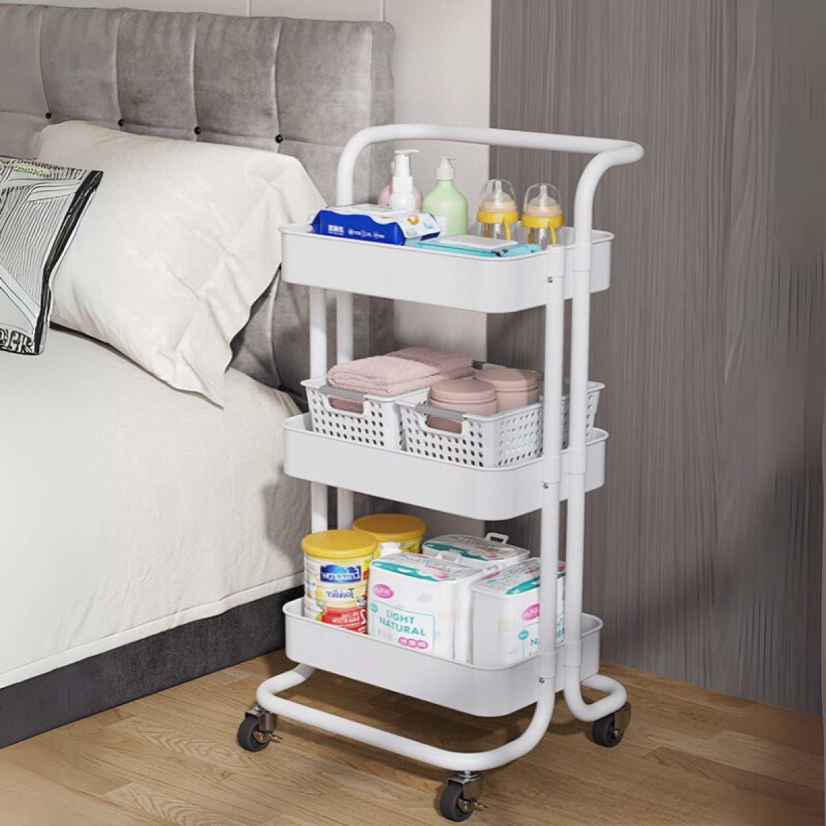 Raft portabil cu 3 niveluri de depozitare Dimensiune 42 (L) x 37 (l) x 85 (H) cm, metal Capacitate mare de depozitare - proiectat cu 3 cosuri perforate care poate acomoda fructe, legume, vase, articole de baie etc. Raftul vine in dotare inclusiv cu 4 carlige pentru a acomoda diverse accesorii mici. Structura solida - atat cadrul, cat si cele trei cosuri sunt confectionate din metal si asigura o stabilitate solida. Raftul este dotat cu 4 rotile rotative 360° rezistente (2 dintre ele sunt prevazute cu functie de franare) si cu un maner metalic pentru ca acesta sa poata fi tranportat mai usor oriunde e nevoie. Distanta intre cosuri - 28 cm Greutate maxim suportata - 20 kg Greutatea trebuie distribuita egal pe cele 3 cosuri Dimensiuni - 42 (L) x 37 (l) x 85 (H) cm Greutate - 3.2 kg