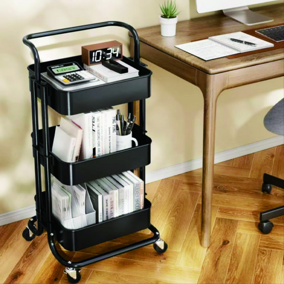 Raft portabil cu 3 niveluri de depozitare Dimensiune 42 (L) x 37 (l) x 85 (H) cm, metal Capacitate mare de depozitare - proiectat cu 3 cosuri perforate care poate acomoda fructe, legume, vase, articole de baie etc. Raftul vine in dotare inclusiv cu 4 carlige pentru a acomoda diverse accesorii mici. Structura solida - atat cadrul, cat si cele trei cosuri sunt confectionate din metal si asigura o stabilitate solida. Raftul este dotat cu 4 rotile rotative 360° rezistente (2 dintre ele sunt prevazute cu functie de franare) si cu un maner metalic pentru ca acesta sa poata fi tranportat mai usor oriunde e nevoie. Distanta intre cosuri - 28 cm Greutate maxim suportata - 20 kg Greutatea trebuie distribuita egal pe cele 3 cosuri Dimensiuni - 42 (L) x 37 (l) x 85 (H) cm Greutate - 3.2 kg