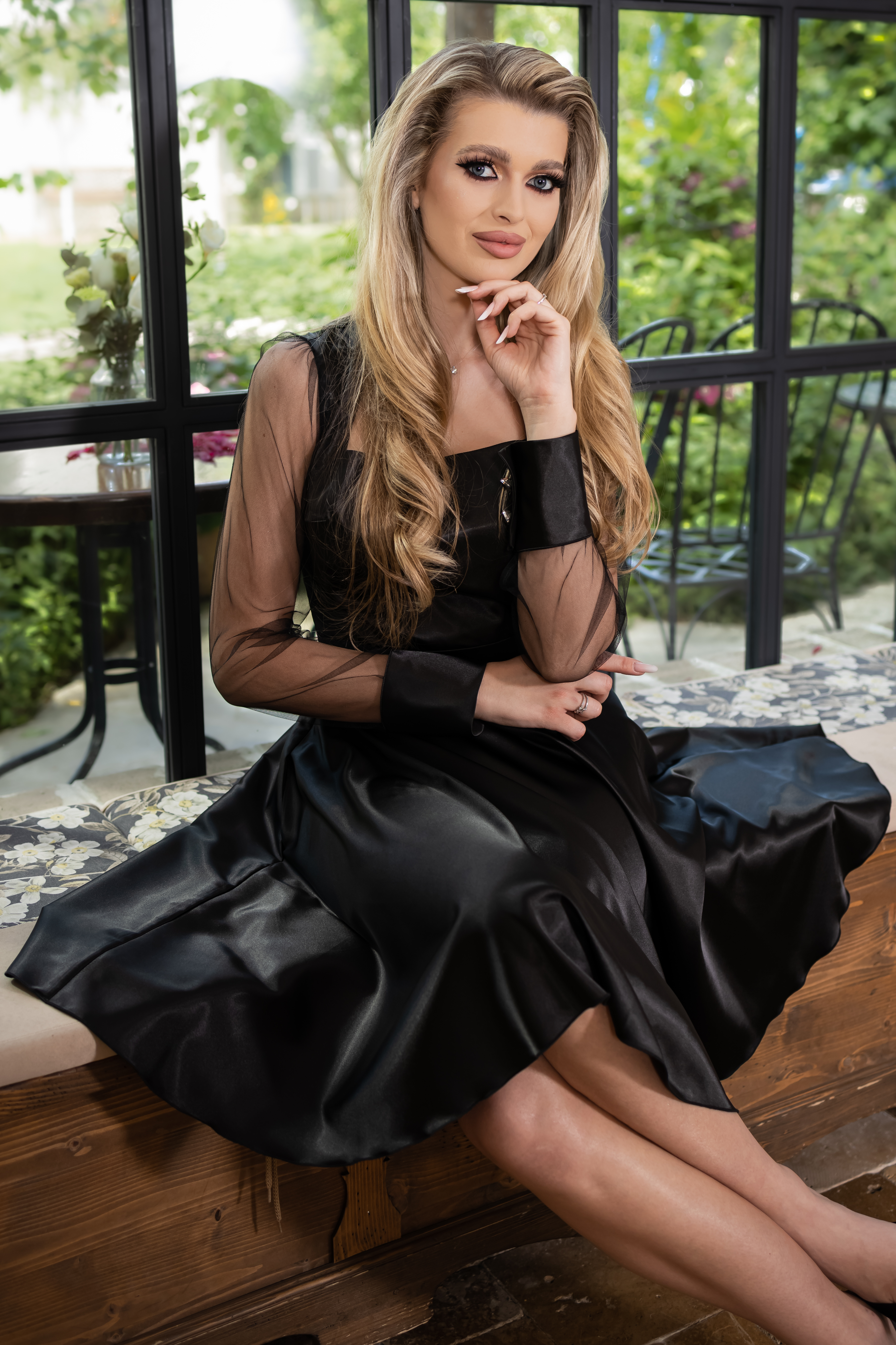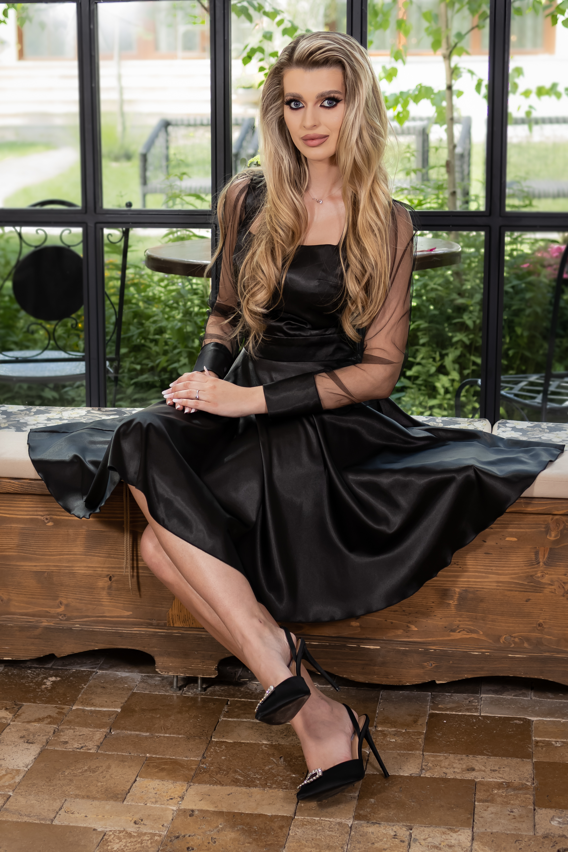Rochie cu maneci din satin si tulle, Negru, Xara