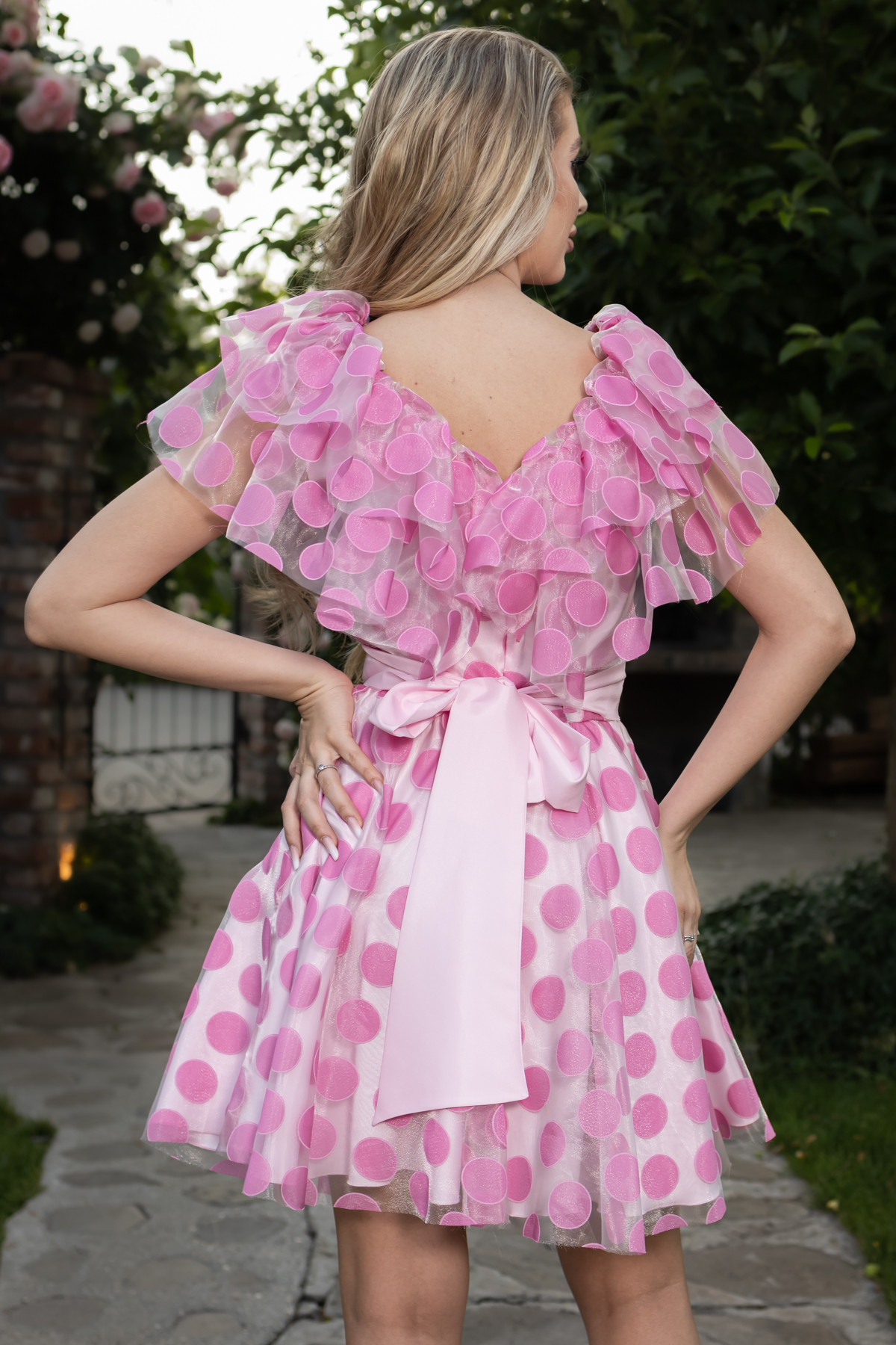Rochie, eleganta din satin si tulle cu buline, roz.Culoare: rozCroi: corset si croi in clospe umeri, cu decolteu in V, si volanseTextura: satin si tulleInchidere cu fermoar la spatePrezinta dublura din satin pe interiorCompozitie: 100% poliester Modelul are 1,70 m inaltime si poarta masura S. INFO: Echipa noastra face toate eforturile in a prezenta cat mai bine culorile produselor prezentate pe site insa culorile pot diferi de situatia reala si pot varia in functie de setarile monitor